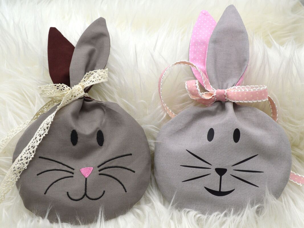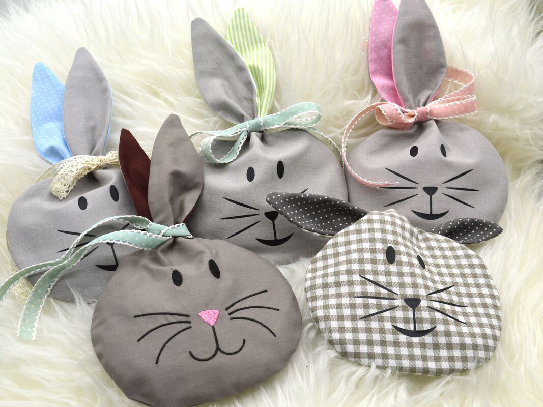 Kleine Hasenbeutel, die sehr schnell genäht sind. Die Ohren können entweder einmal geknotet oder mit einem Bändchen zusammengebunden werden, dann stehen diese lustig nach oben.