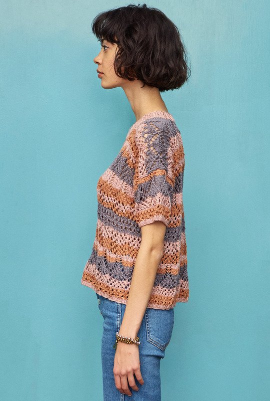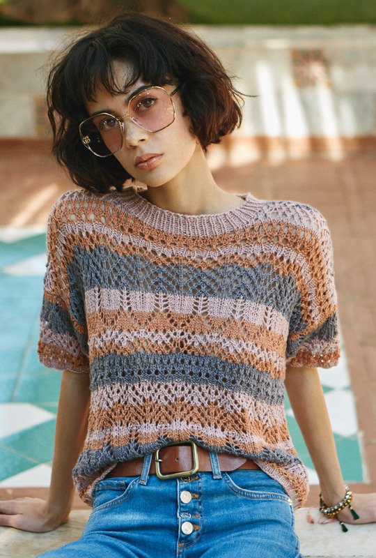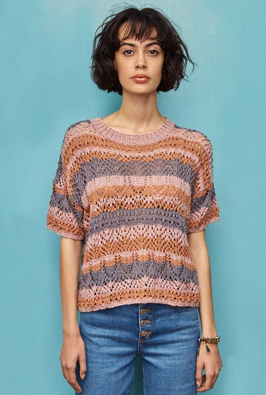 Einmal alles bitte: Wie bei diesem Mix aus filigranen Ajourmustern und sanften Farbtönen, die sich streifenweise in Szene setzen – wunderschön dargestellt bei diesem Kurzarmpulli, der nicht nur Festival-Queens überzeugt. Gedämpft und elegant wirkt der Mix, aus Zimt, Puder und softem Grau. Gestrickt wird der Sommerpulli in Einzelteilen von unten nach oben. Direkt nach dem Anschlag geht es auch schon los mit dem Ajourmuster in der Streifenfolge. Das Muster ist nicht allzu schwierig, benötigt aber schon ein wenig Konzentration. Die übersichtliche Strickschrift sorgt dafür, stets den Überblick im Muster zu behalten. Sind alle Teile fertig gestrickt, werden noch die Nähte geschlossen und aus den Maschen des Halsausschnitts die Rippenblende herausgestrickt. Am besten nimmt der fertige Pullover jetzt noch ein kleines Bad und wird im Liegen getrocknet. Dabei schön in Form bringen und glattstreichen – so öffnet sich das Lacemuster und entfaltet seine ganze Pracht.