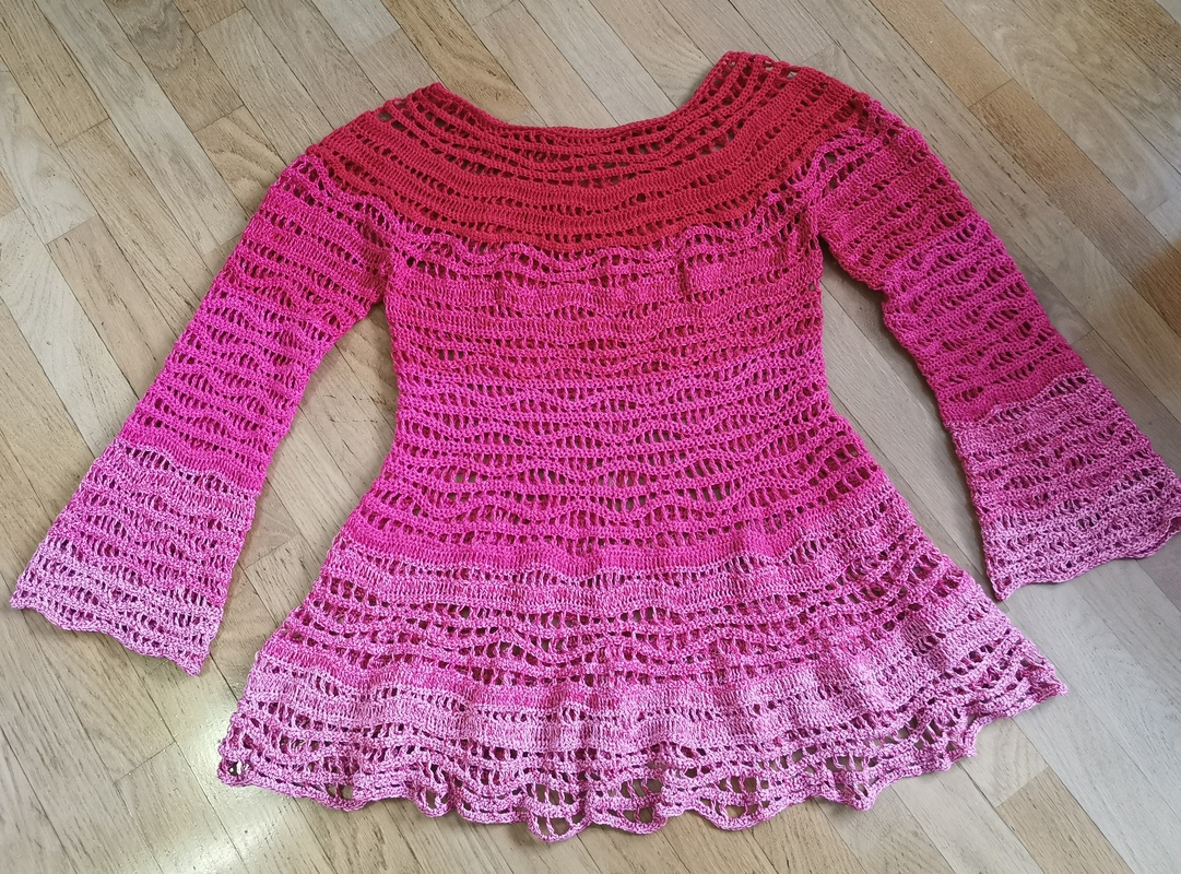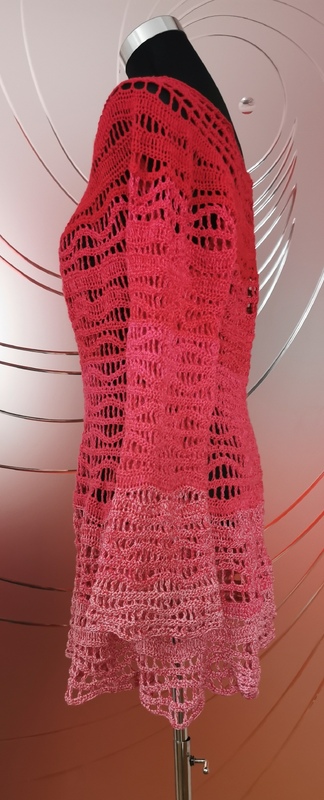 Es wird komplett in einem Stück mit Rundpasse von oben gearbeitet, die Ärmel werden direkt angehäkelt und es lässt sich mühelos an alle Größen und Längen anpassen.