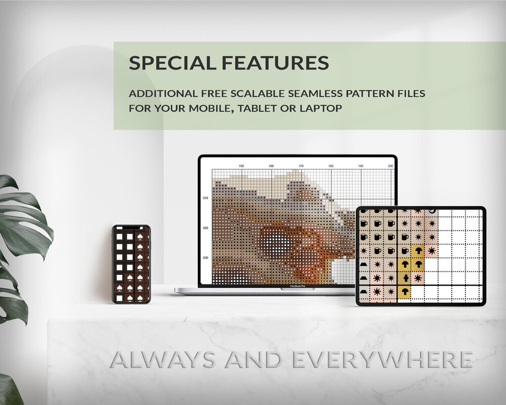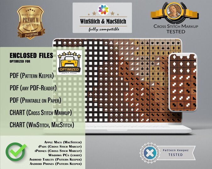 You will receive the cross stitch pattern as PDF files, available for instant download. The digital files are optimized for printing an paper or fore use on the screens of tablets, mobile phones or laptops (well tested for Pattern Keeper, WinStitch, etc.). You can buy these files right here and download them immediately.