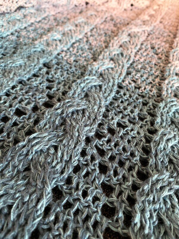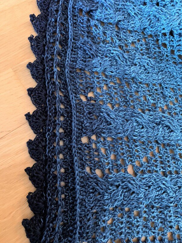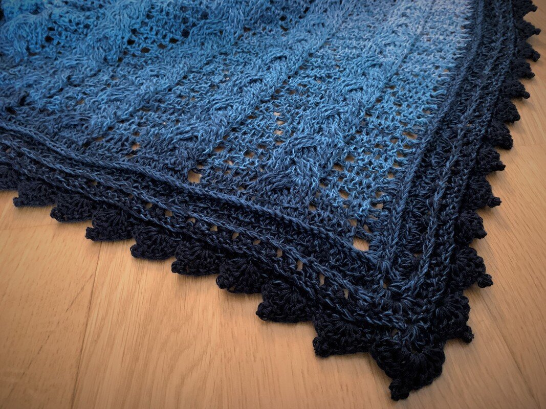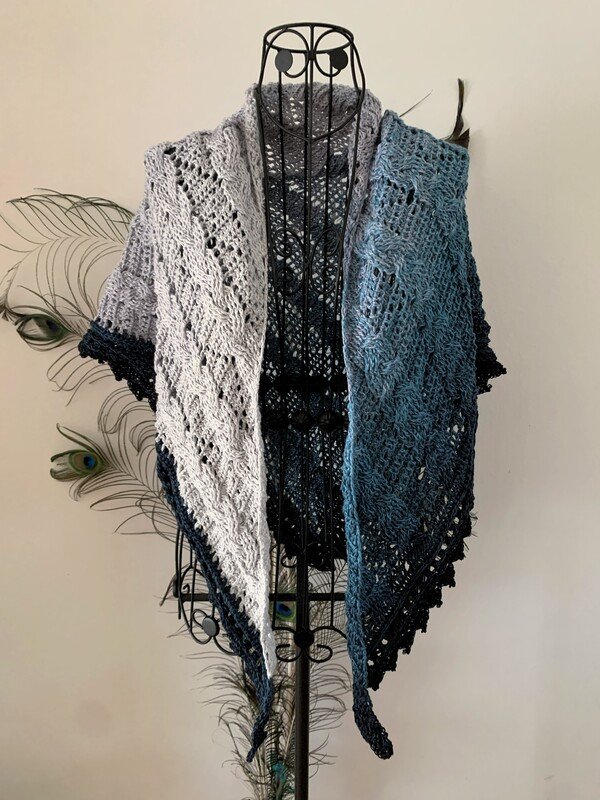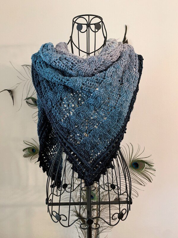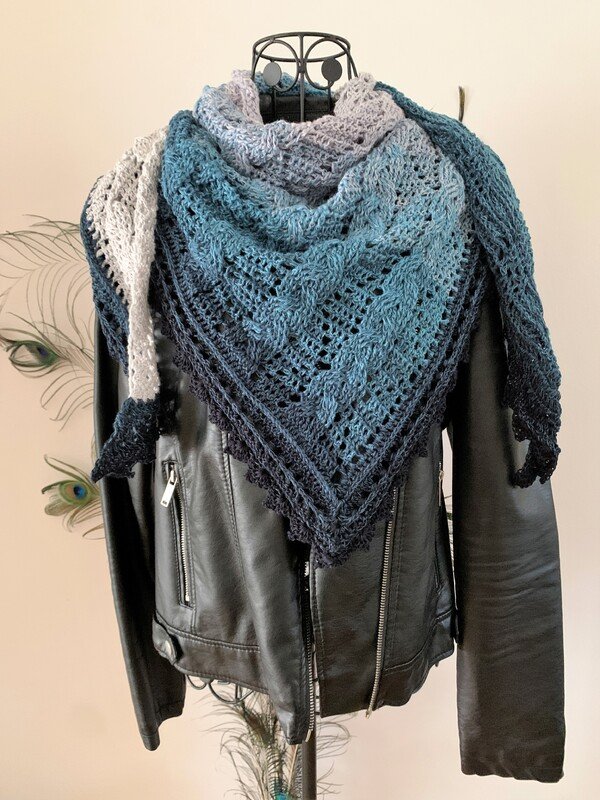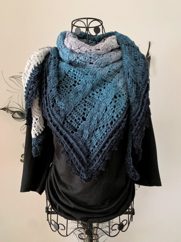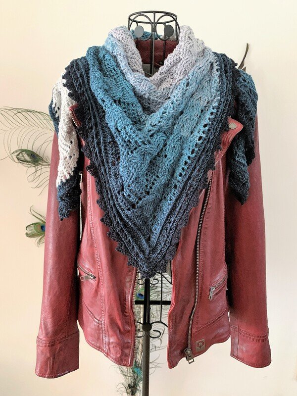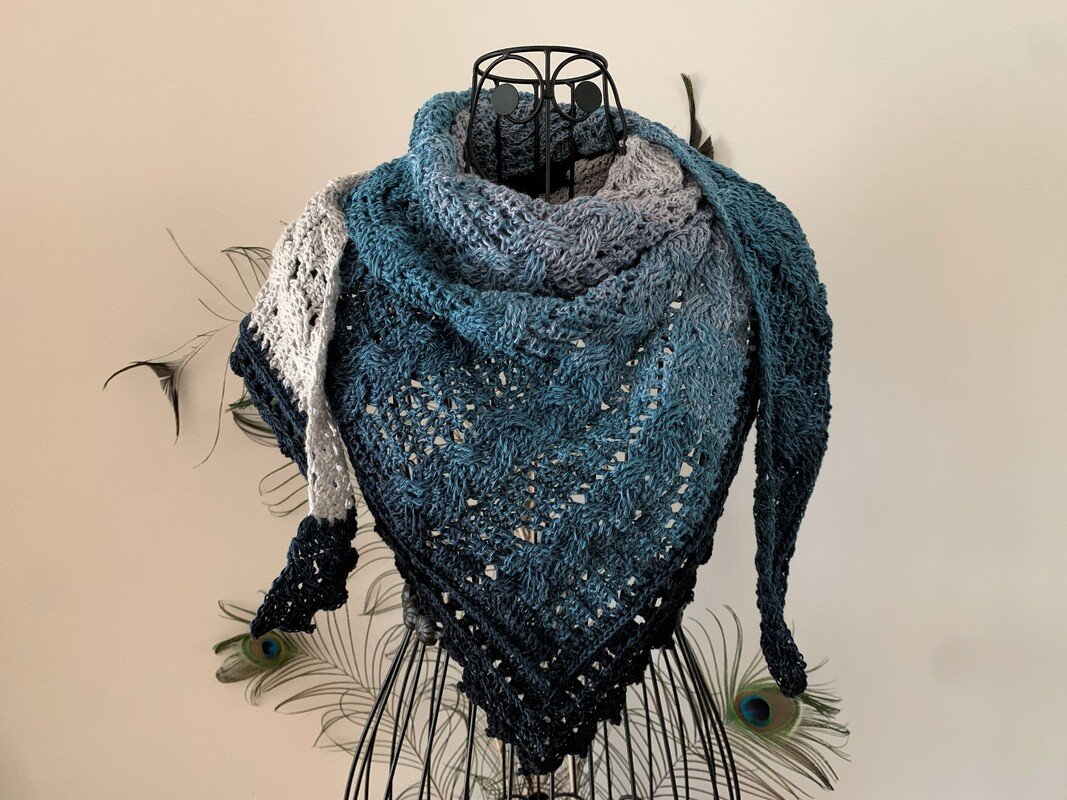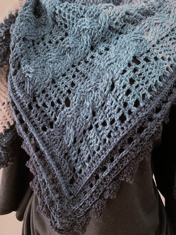A beautiful new triangular shawl "Kabye" is ready, it has a eye-cathing braid-pattern, but is not too heavy/dense, because of the stripes between the braids. The wonderful border around the scarf makes it something really special.