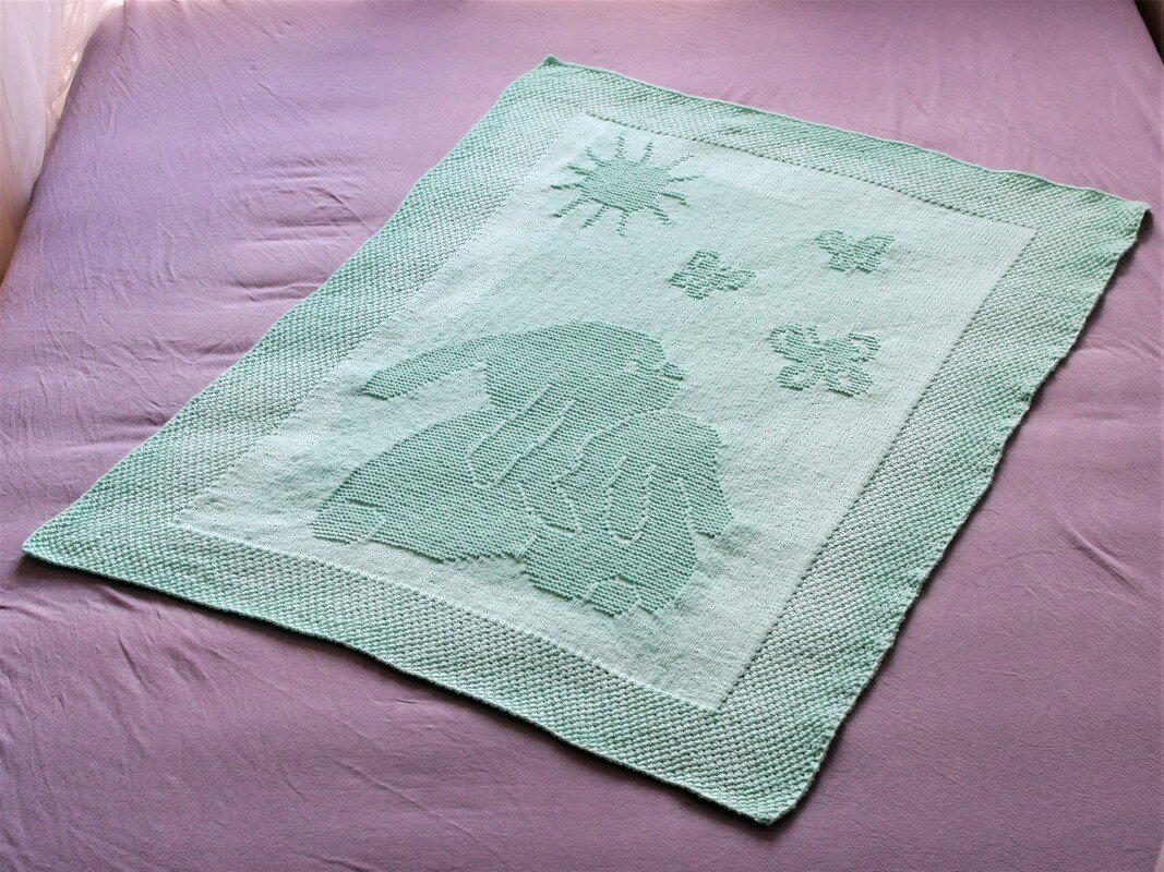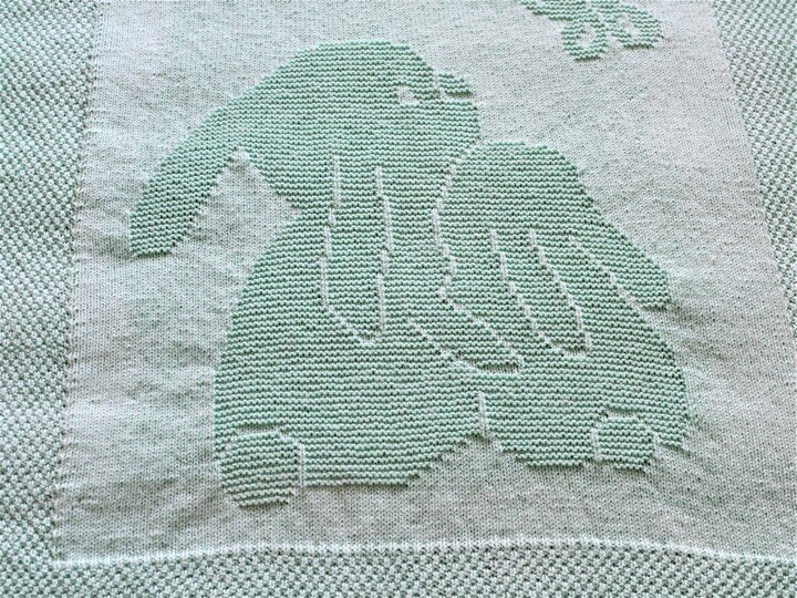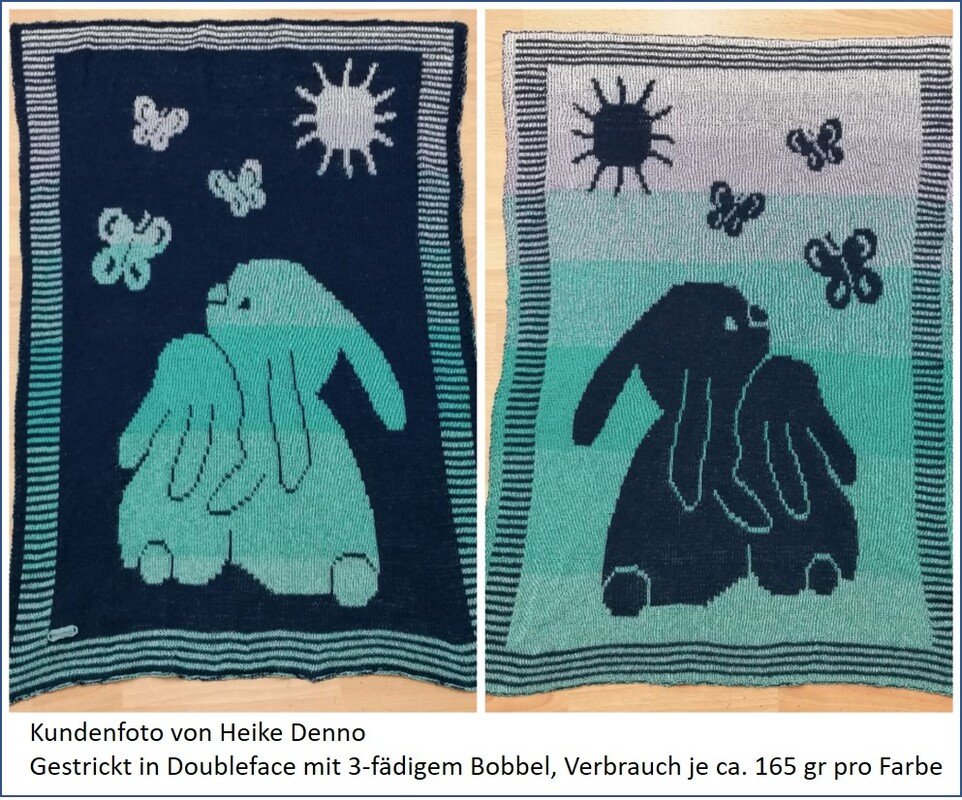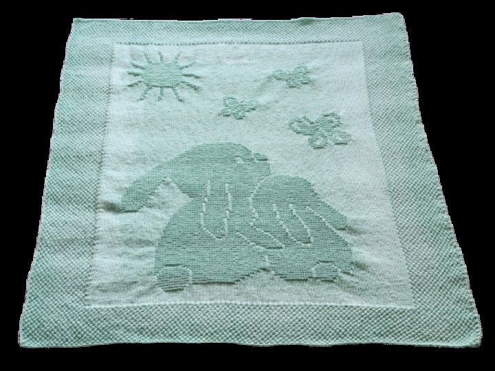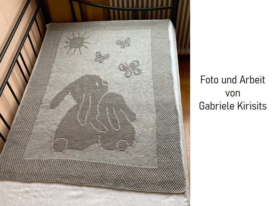 The intense feeling of happiness when you hold a beloved child in your arms, or when a child cuddles closely to Mum or Dad and feels totally sheltered, is captured in this motif. The taller bunny could also represent an older sibling, of course. This blanket is a lovely present for a newborn baby – with best wishes for many moments of happiness in his or her life!