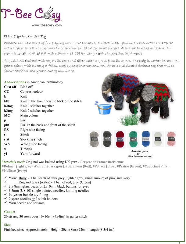 Children will have hours of fun playing with El the Elephant. Knitted in DK yarn on smaller needles to keep the weave tighter so that no stuffing can be seen nor pulled out by small fingers. Also great to make gifts and fair products to sell. Knitted flat with 3.5mm (US #5) knitting needles to give that tight weave