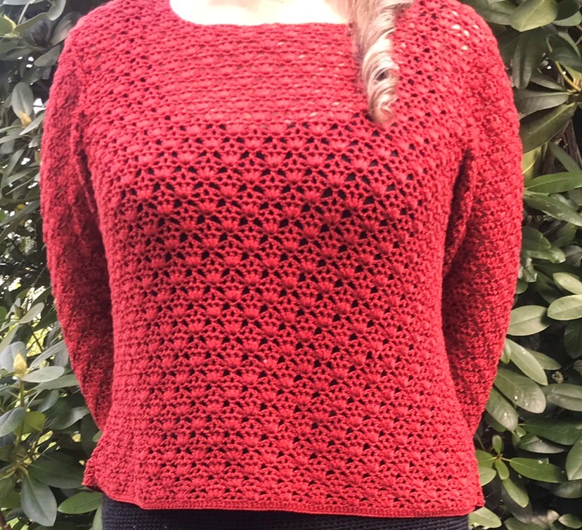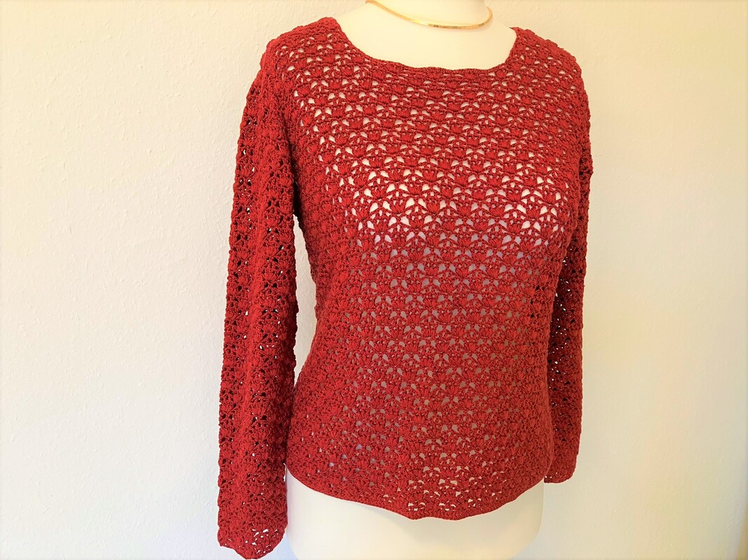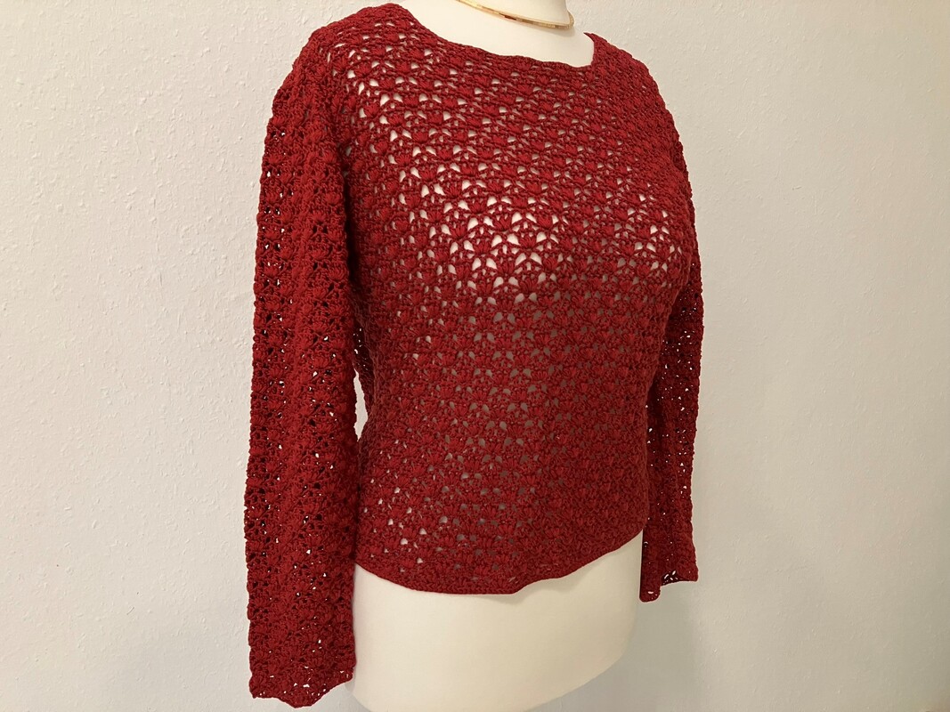 Dieser Pulli ist ein echter Hingucker für den Abend oder für alle Gelegenheiten an warmen Tagen. Das Muster bringt das Glanzgarn voll zur Geltung. Es ist durchscheinend. Drunter trägt man entweder einfach nur einen BH (z.B. in schwarz) oder ein schwarzes Top (wie hier auf dem Foto). Hautfarbene Dessous sind auch super geeignet.