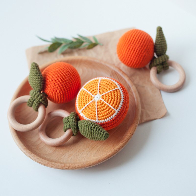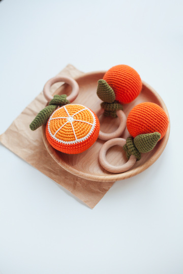 The pattern includes a description of crochet rattles in the form of a half orange and a round tangerine.