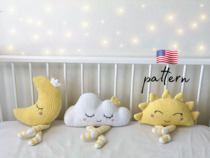Plush pattern of 3 crochet pillows: Cloud, Moon, Sun (PDF file)
