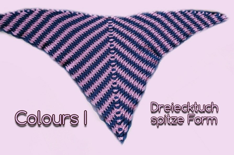 Ich habe den Namen Colours gewählt, weil es sich um ein Kontrasttuch handelt, wobei einer der beiden Fäden möglichst farbenfroh sein sollte, damit das Muster seine volle Wirkung entfalten kann. Es gibt verschiedene Versionen. Das Colours I ist ein spitzes Dreiecktuch. Für alle Liebhaber der flacheren Tücher habe ich das Colours V beigefügt. Es wird zunächst das Colours I beschrieben und dann die flachere Version, die eher die Form eines klassischen Dreiecktuchs hat. Die weiteren Versionen sind: