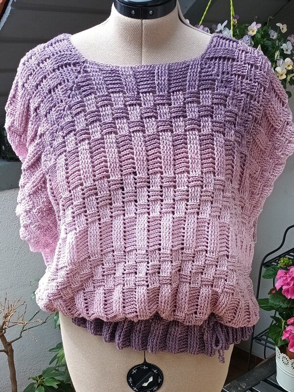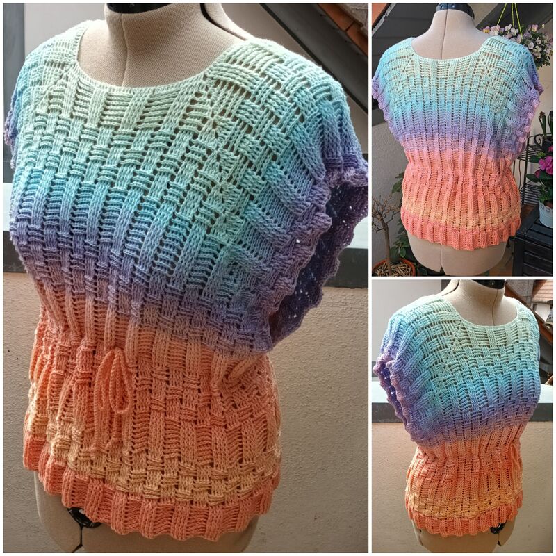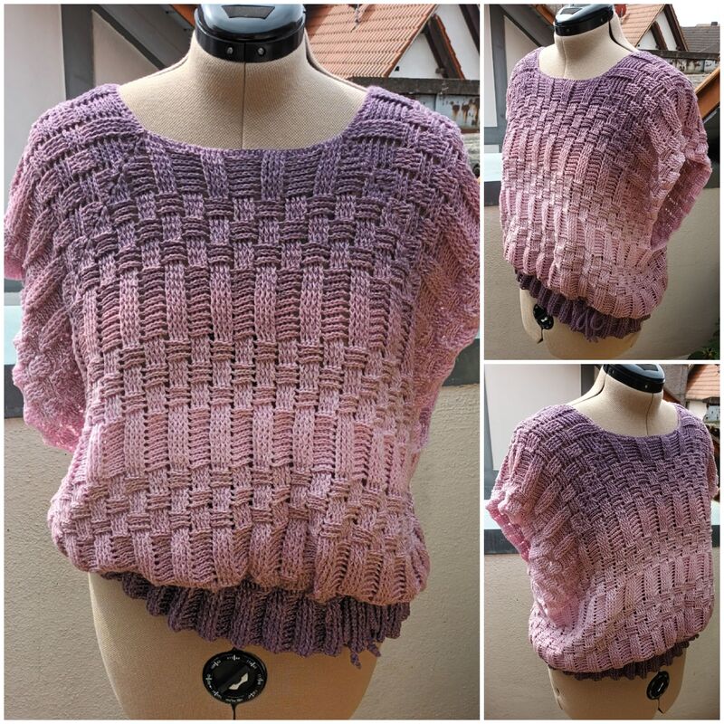Einen 3-fädigen Bobbel (gefachtes Farbverlaufsgarn, 50% Baumwolle/50% Polyacryl). Ein 3-fädiger Bobbel hat eine Lauflänge von ca. 250m/50g oder jedes beliebige Garn mit entsprechender Lauflänge. Das Muster und der Schnitt sind kleine Garnfresser und damit er trotzdem nicht zu schwer wird, solltest Du bei dieser Lauflänge bleiben.