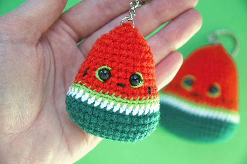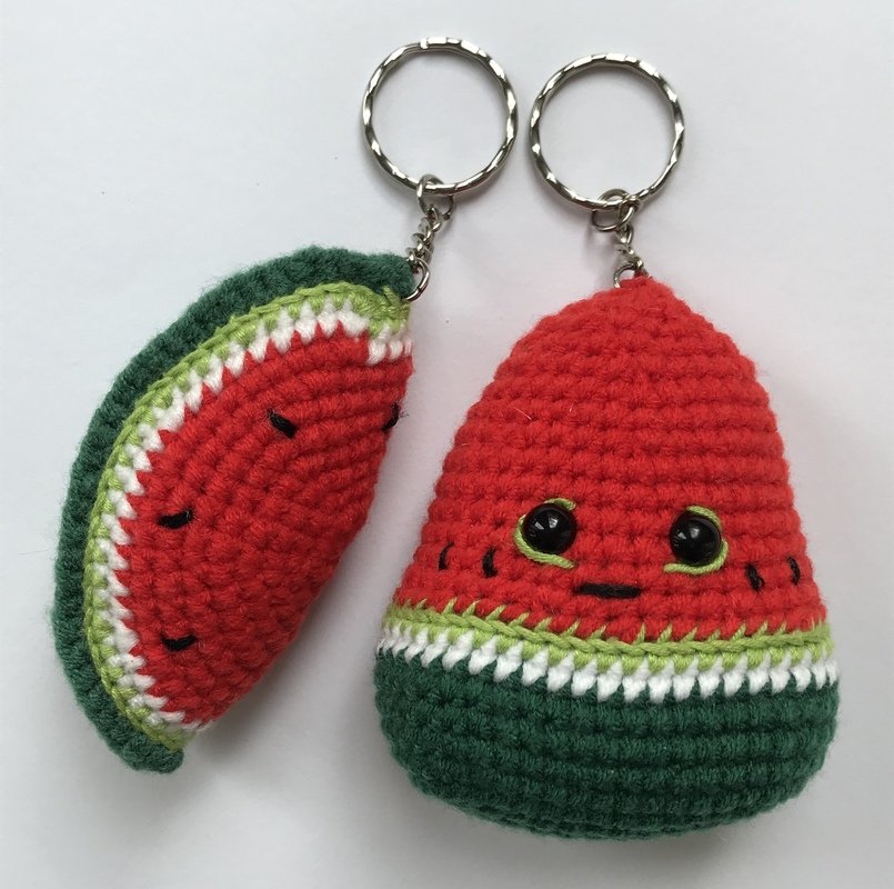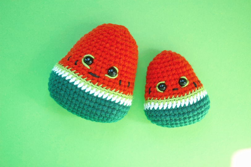 The triangle water melon is only crocheted in the round and also involves colour changes.