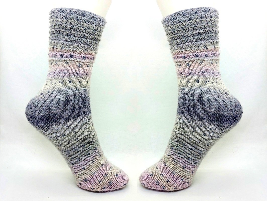 Maschenprobe: 4-fach Sockenwolle, Nadelspiel mit der Nadelstärke 2,5 mm, 10 x 10 cm = 47 Reihen und 32 Masche Masche.