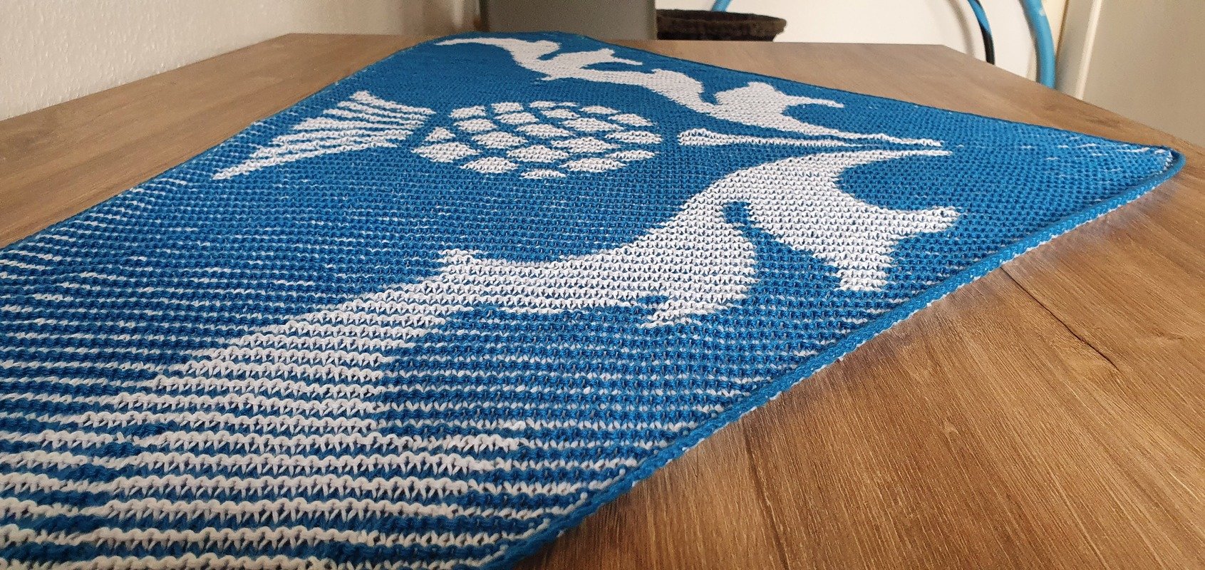 The finished shawl measures approximately 175 cm (width) x 78 cm (depth) in my version.