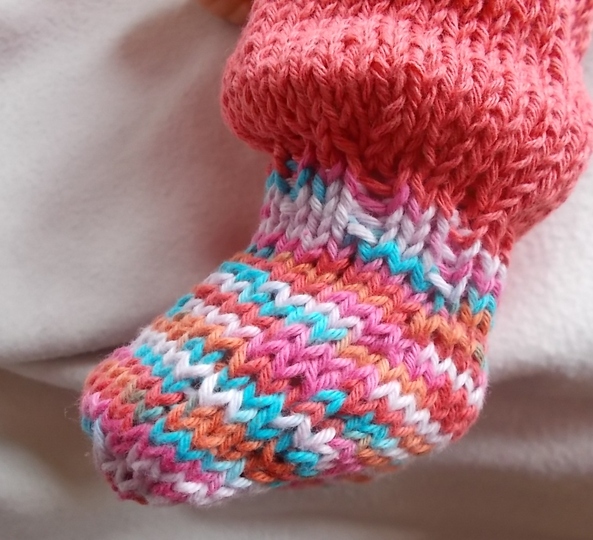 Die Hose hat ein eingestricktes Herzmuster auf den Knien. Beim Stricken der Füße bekommst du einen Einblick in die von mir entwickelten Socken mit der mowi-Ferse. Hier musste ich sie bei der winzigen Größe allerdings etwas abwandeln. Am einfachsten lässt sie sich mit 3 Nadeln stricken.