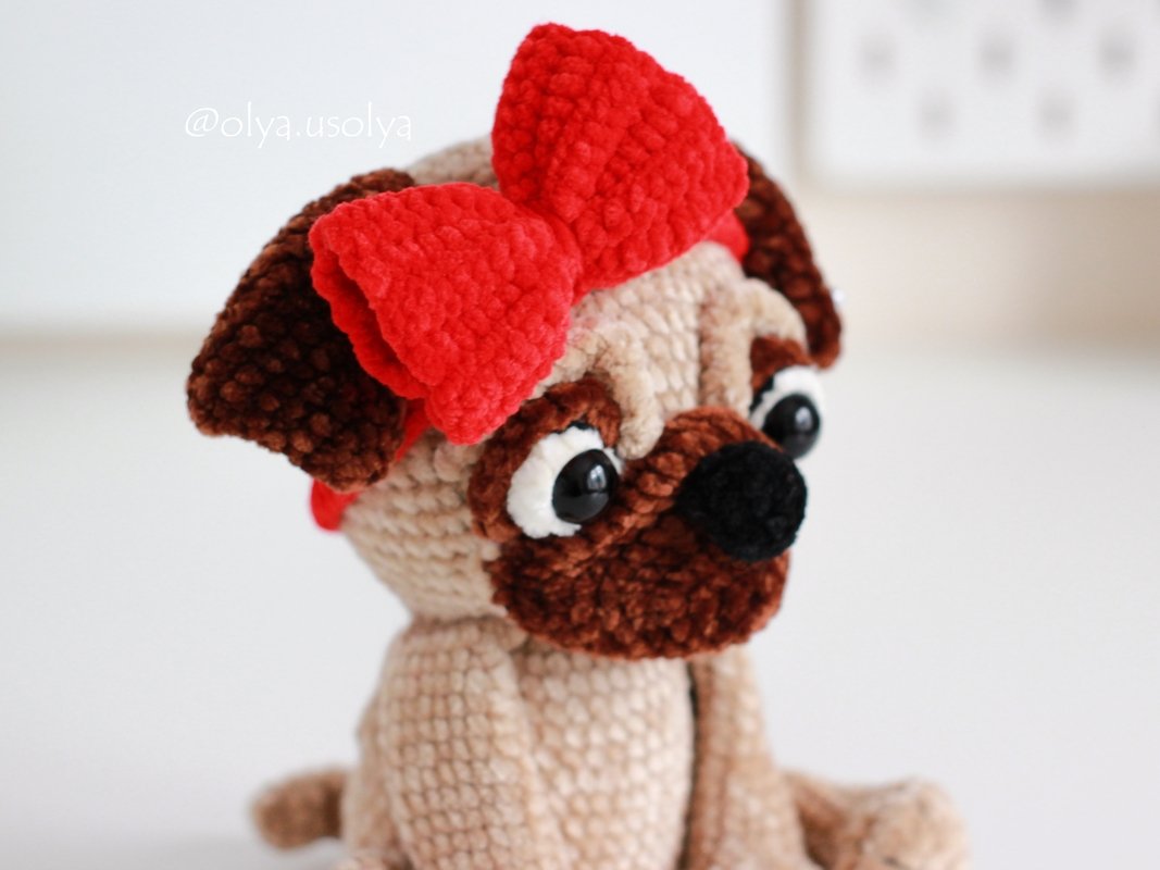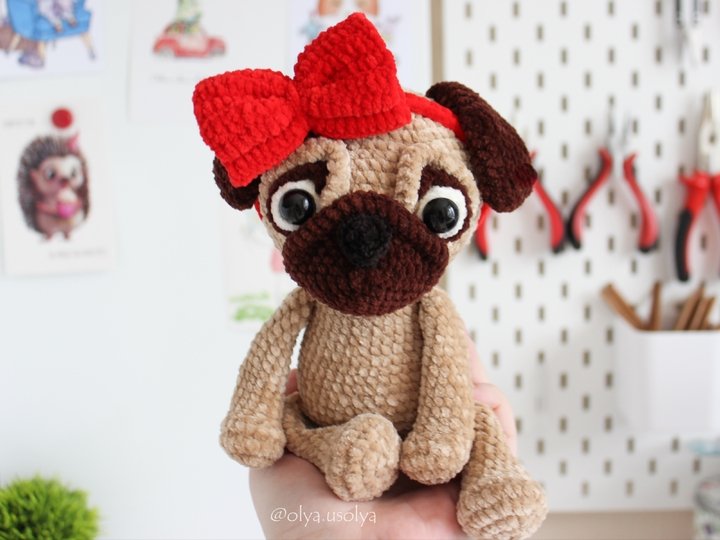 With this crochet pattern you can crochet stuffed amigurumi toy "Anabelle the pug" using a plush yarn according to the original pattern by Olya Usolya.