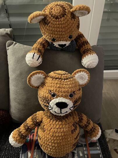 Timmy Tiger ist ca. 30 cm groß, aber Sie können die Größe leicht an Ihre eigenen Vorlieben anpassen, indem Sie dünnere Wolle verwenden. Es ist ein wunderbares Geschenk für Jung und Alt und wird mit seiner niedlichen blauen Schleife sicherlich Herzen schmelzen lassen.
