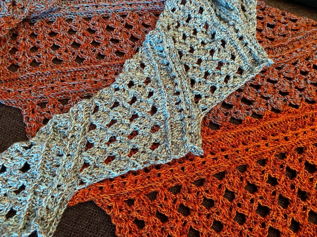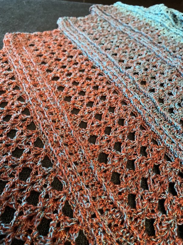 Used wool: Yvies Dreamies (available in the Facebook group Yvies Dreamies), 50% cotton, 50% polyacrylic yarn, 4 threaded bobble, 1300 m, color Oriental; about 1040 m of the bobble were used for the scarf shown on the photos; any other wool can be used as well.