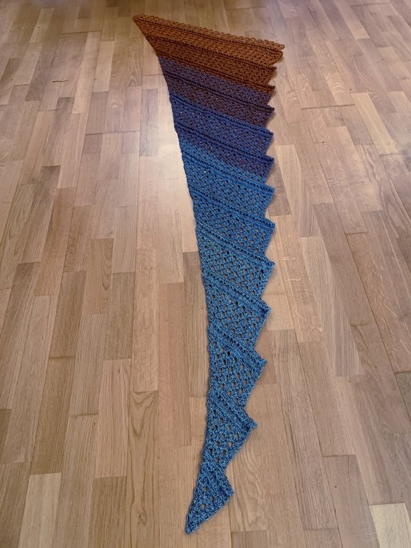 The shawl can easily be crocheted wider (described in the pattern), and the size/length can also be changed according to your preference. Depending on the wool and crochet hook size used, the dimensions may vary a little.