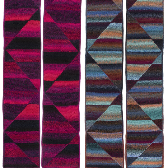 The geometric scarf is knitted in garter stitch, the pattern is created with German short rows.