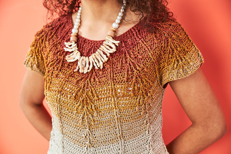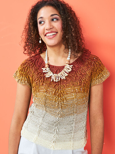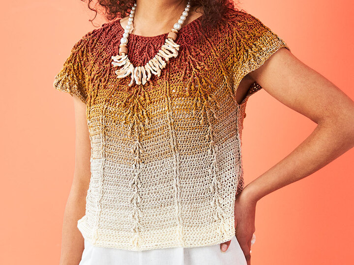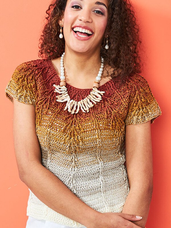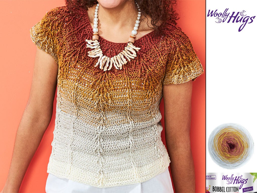 So ein süßer Pulli mit so erfrischenden Farben ist der Sommerhit überhaupt. Er ist aus einem Bobbel Woolly Hugs COTTON mit den neuen Farben, die von weiß nach dunkel verlaufen. Die dunkelste Farbe ist hier ein herrliches Rostrot. Gehäkelt wird der Pulli von oben nach unten und kommt ganz ohne Naht aus. Perfekt für "Nähfaule". Ein schönes Rankenmuster aus Reliefstäbchen zieren die Passe und werden bin ganz nach unten fortgeführt.