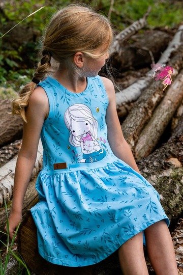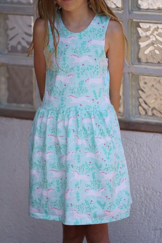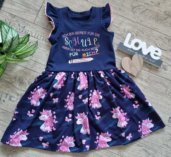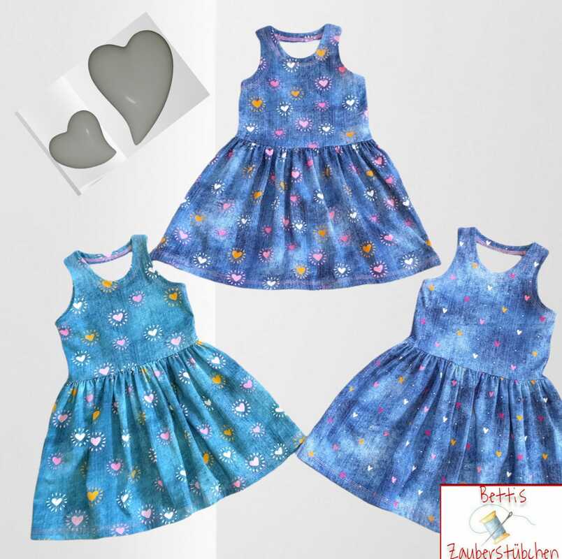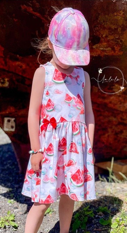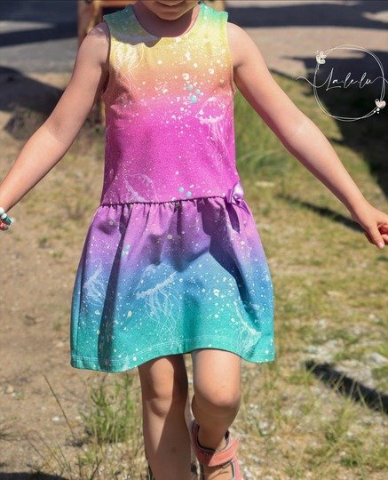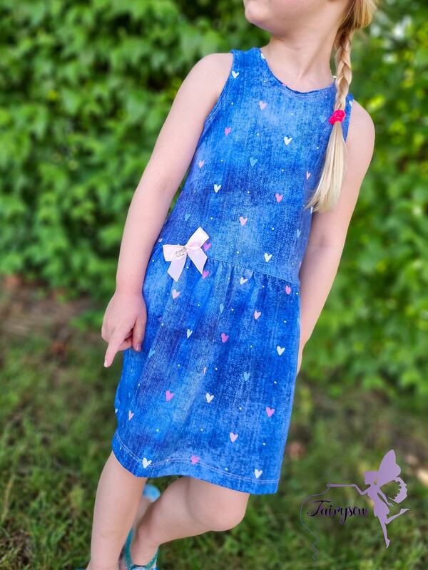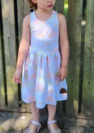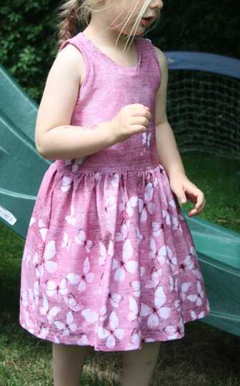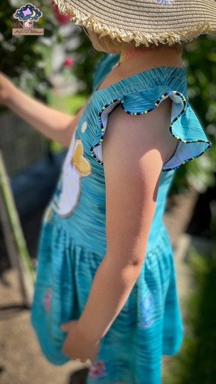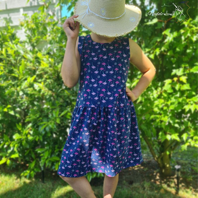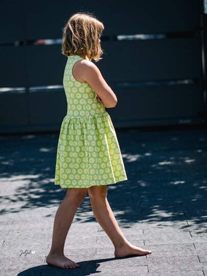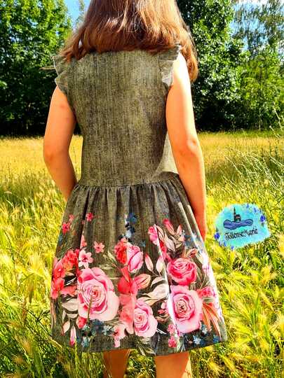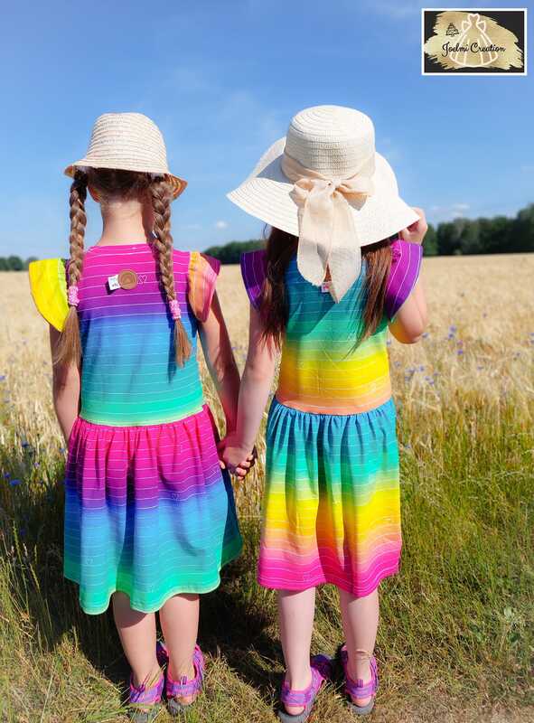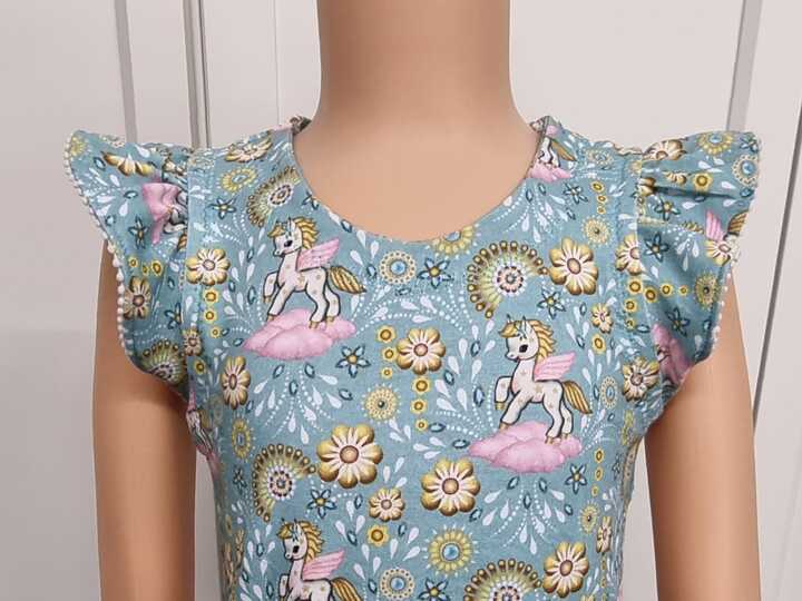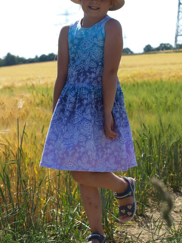 Das Kleid kannst du von Gr. 104 – 164 in Einzelgrößen nähen – und das ganz ohne Bündchen. Die Armausschnitte sowie der Halsausschnitt werden mit Belegen genäht – und wenn du magst, kannst du zusätzlich noch Flügelärmchen mit einnähen.