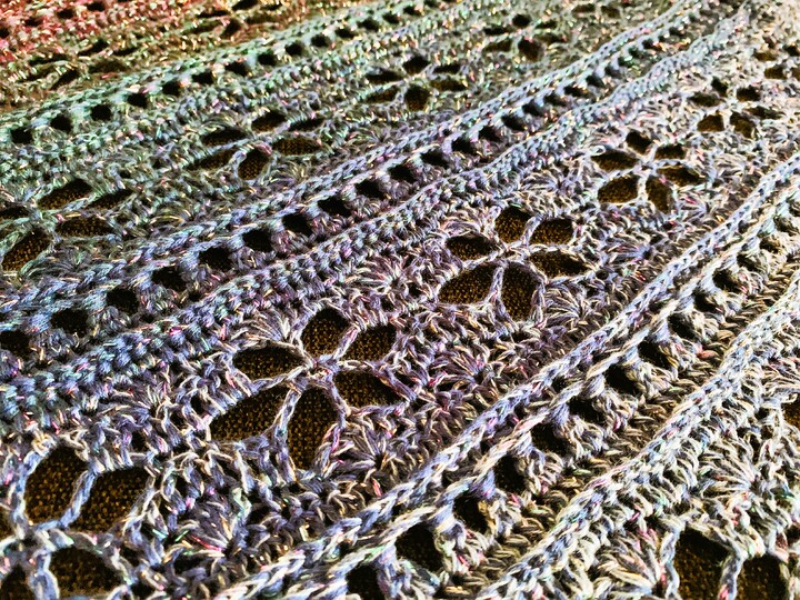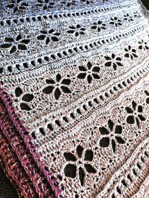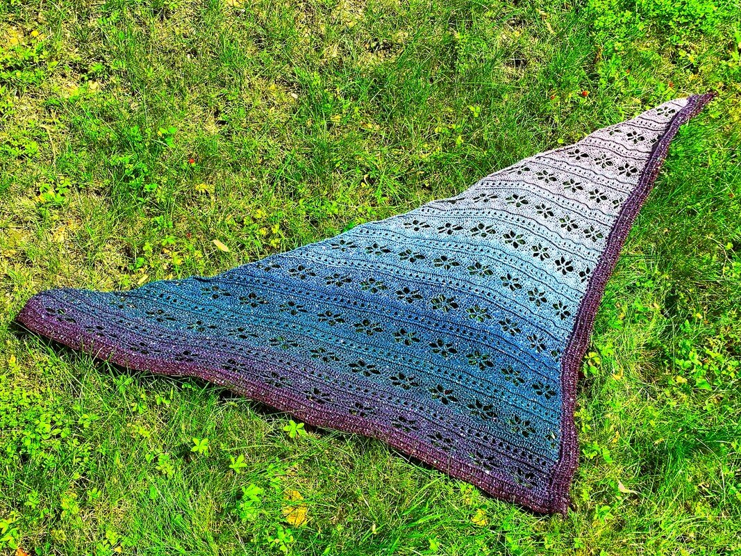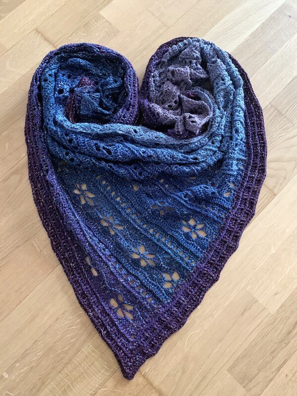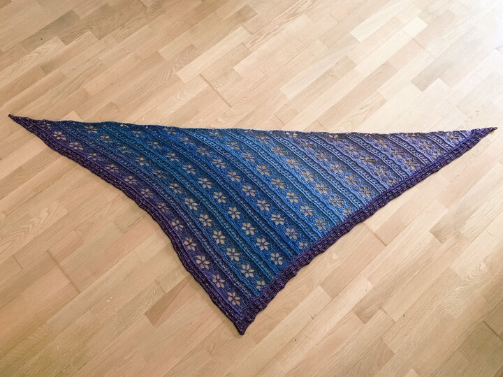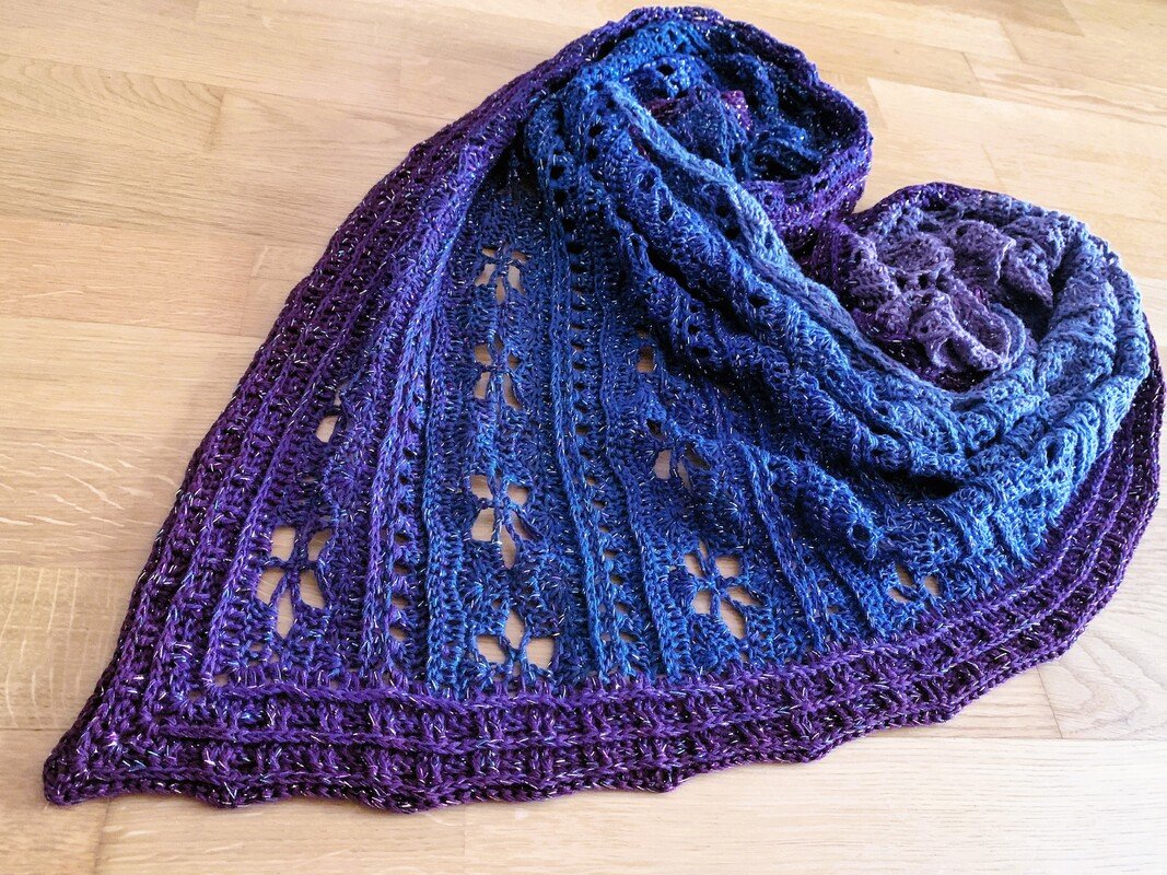 The following wool was used: Lilu's Märchengarne, 4-thread bobble (43% acrylic, 43% cotton, 9% polyester, 5% polyamide), 1140 m length, 300 g, color: Sternenglanz - the whole bobble was used for the shawl.