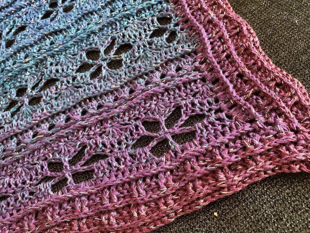 The pattern is aimed at a little advanced crocheters who can cope well with the stitches listed below. The shawl is asymmetrical, increases are made on one side only. The edge can be crocheted as wide as you like, or omitted if you wish.