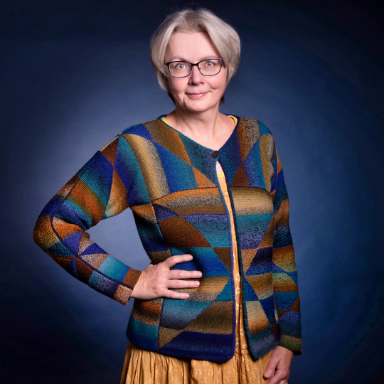 The geometric cardigan is knitted in garter stitch, the pattern is created with German short rows.