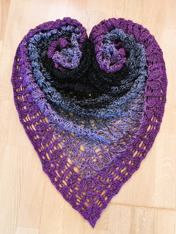 Following wool was used: Lilu's Märchengarne, 4-thread bobble (43% acrylic, 43% cotton, 9% polyester, 5% polyamide), 1140 m length, 300 g, color: Mystery Purple - the whole bobble was used for the shawl.