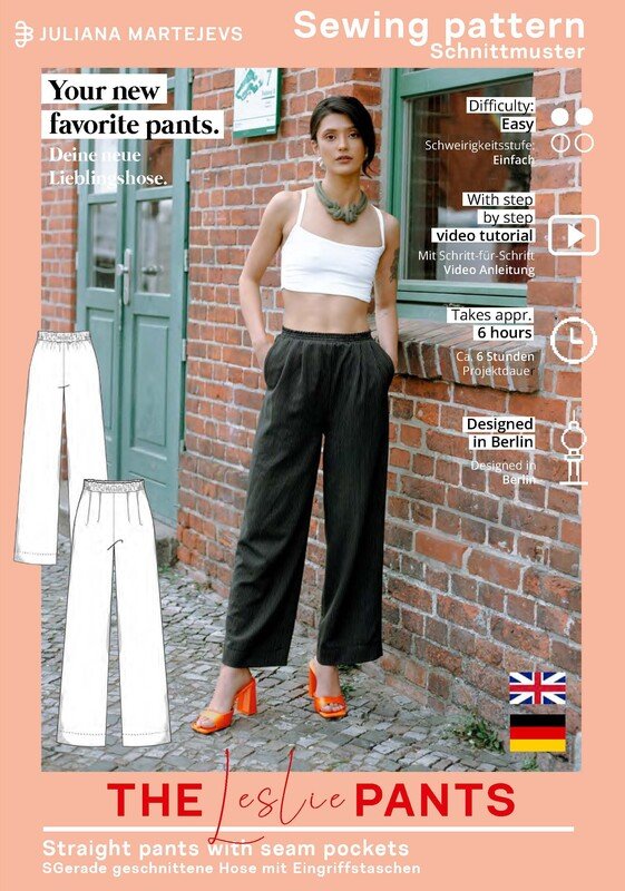 The sewing pattern as an ebook for your new favorite pants "The Leslie Pants". With a free video tutorial on our YouTube channel JULIANA MARTEJEVS - The DIY fashion label or on our website (see profile).