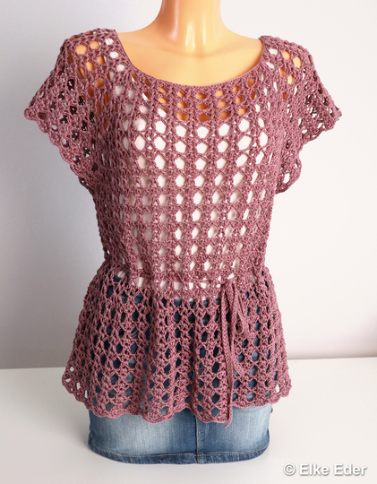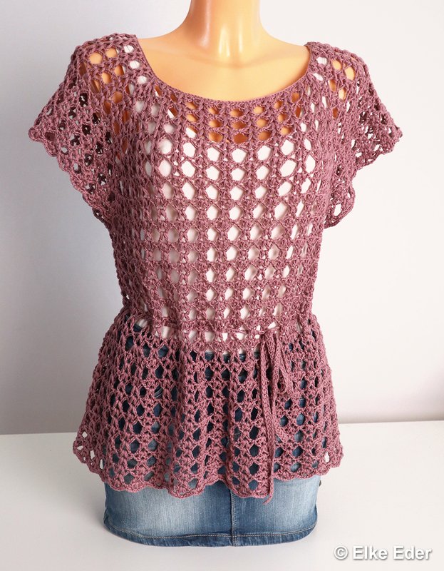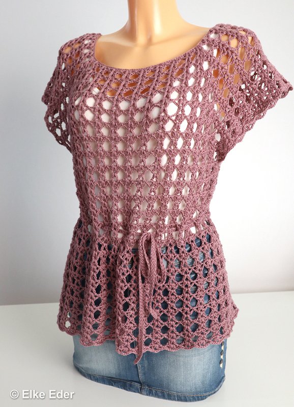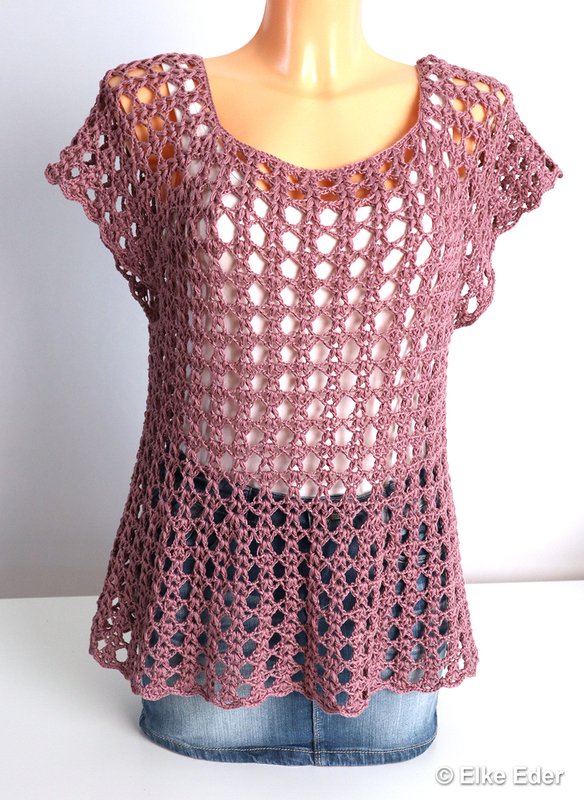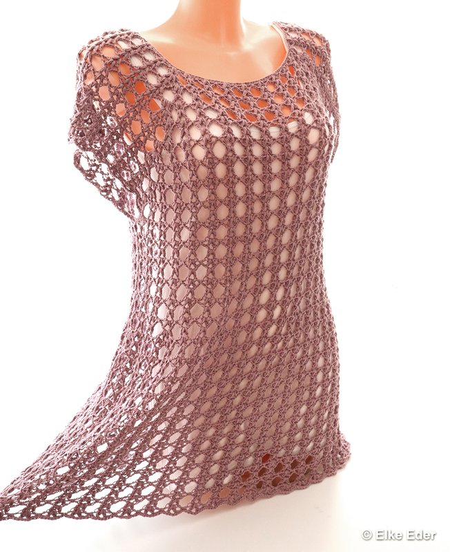 The crochet pattern shows you how to crochet the tunic in one piece from top to bottom (top-down raglan), which makes it perfect for gradient yarns or yarn cakes. You can make the summer shirt in any length you like – the photos show two different lengths.