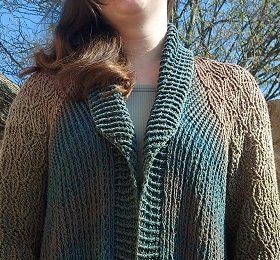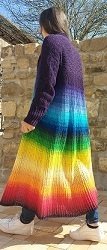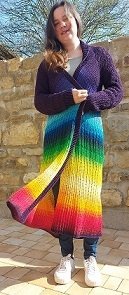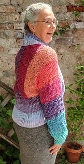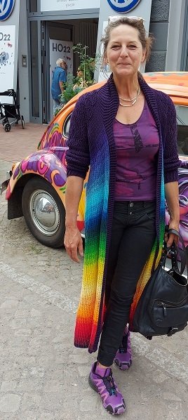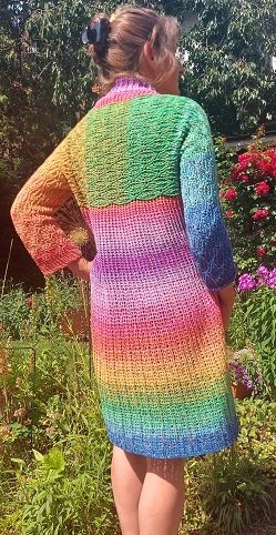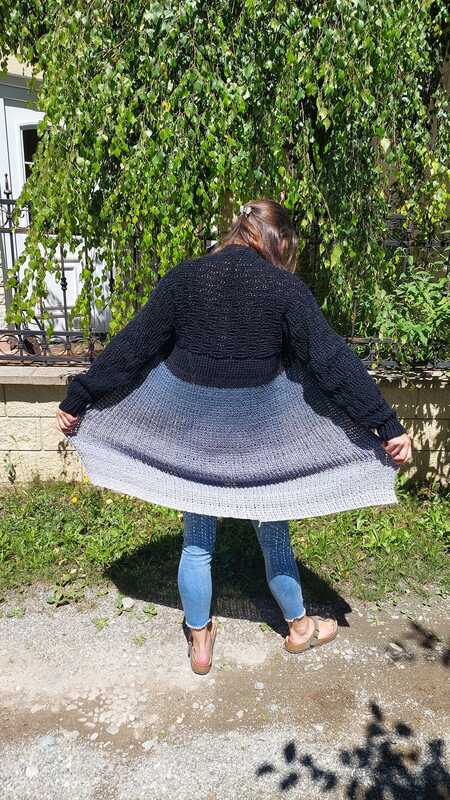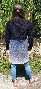 Zuerst wird der Ärmelschal gehäkelt, von einem Ärmel über den Rücken zum anderen, an einem Stück. Daran wird dann der Rest des Mantels angehäkelt - also sozusagen alles ohne Naht. Wie, was und wann, wird genau in der Anleitung beschrieben.