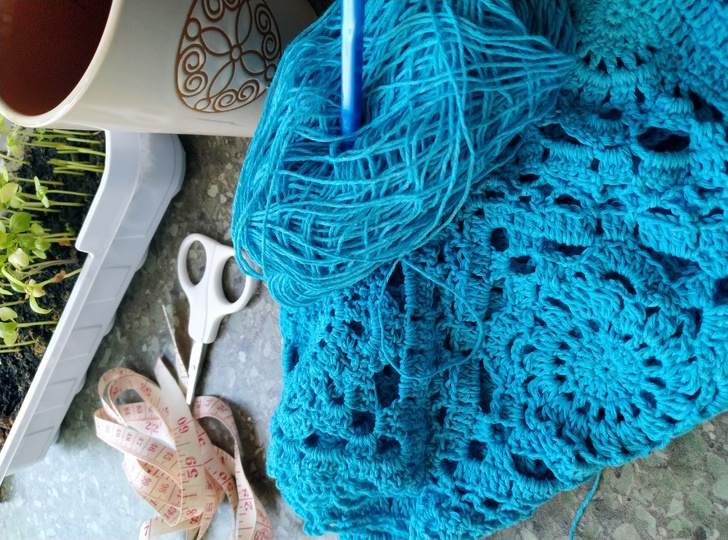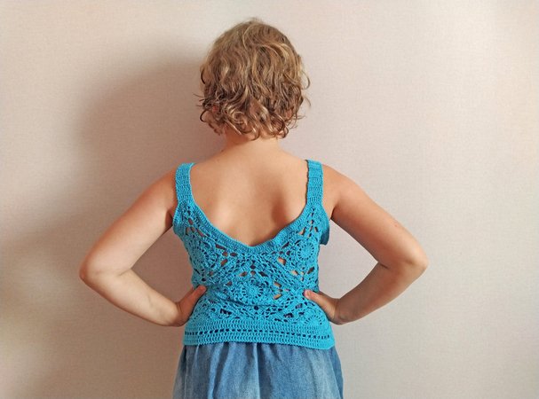 Light lace crochet sleeveless tank top for girl. Crocheted from eight motifs. Good for summer days.