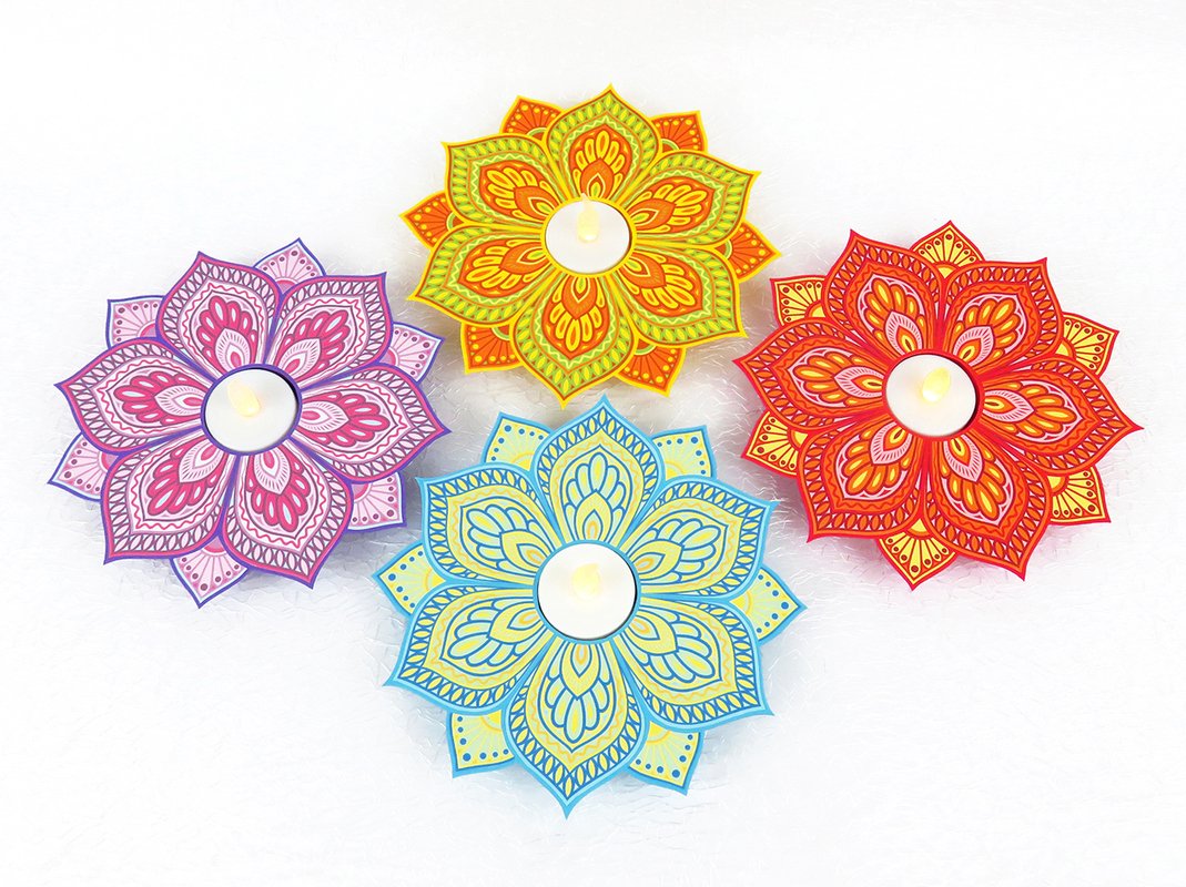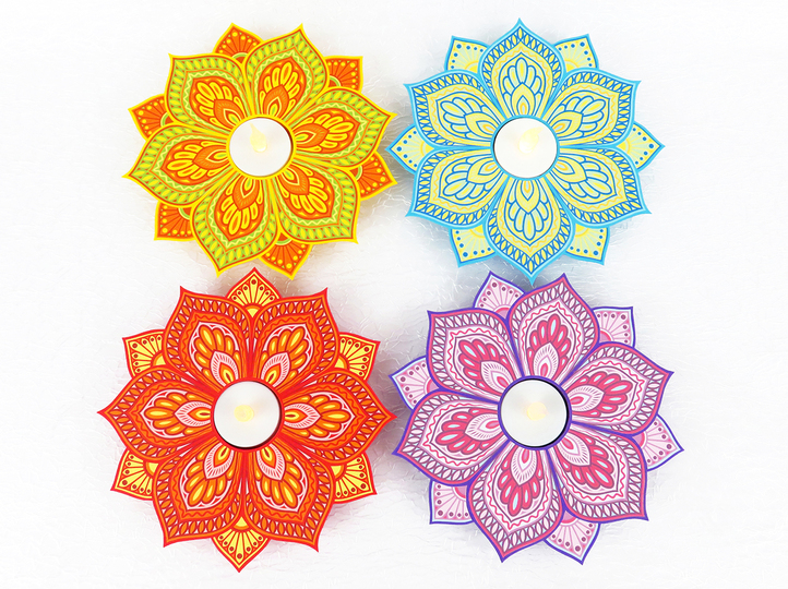 Damit du eine größere Farbauswahl für deinen Teelichthalter hast, habe ich Motive in vier Farbrichtungen angelegt. Für die drei zusätzlichen Halter habe ich Fotokarton in Goldgelb, Hibiskus und Himmelblau verwendet.