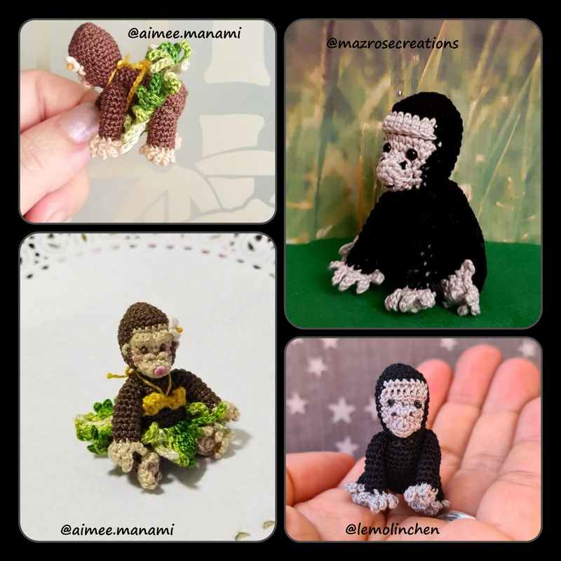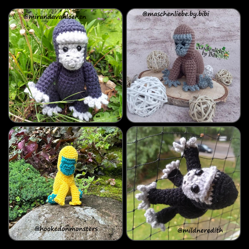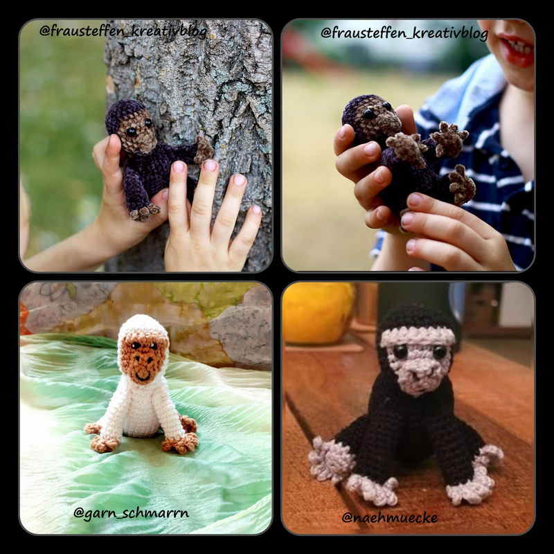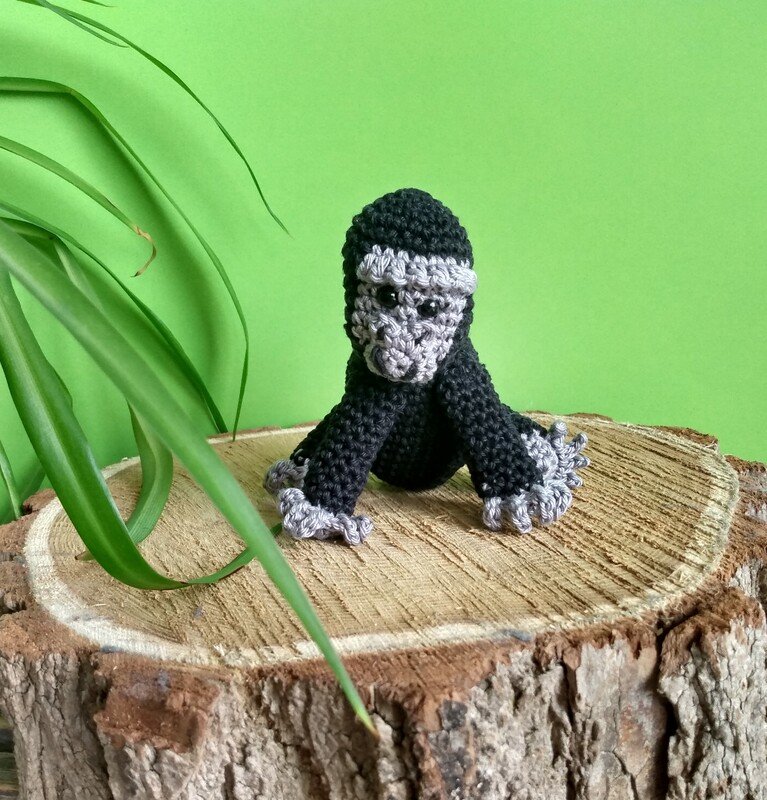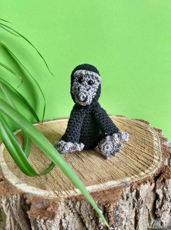 Dimensions: around 10 cm long, 5 cm wide and 12 cm tall. (Be careful, if you‘re using a crochet hook in a different size, the gorilla will be bigger or smaller.)