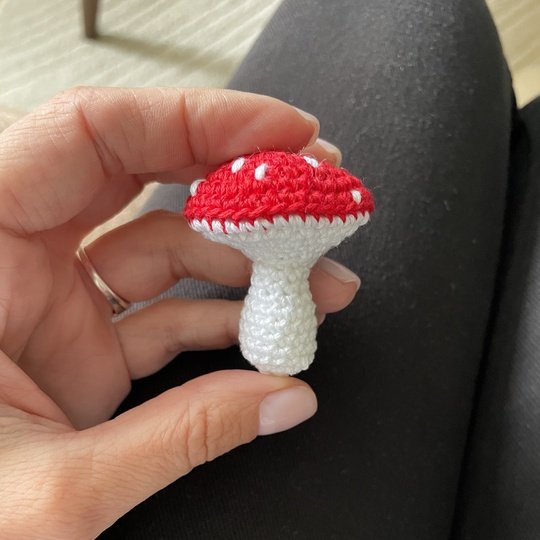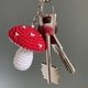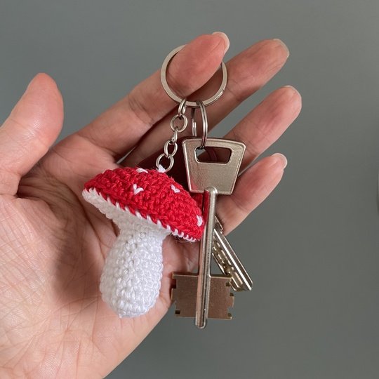 This amigurumi pattern of cute amanita mushroom with keychain ring will be a cheerful gift for your friends and roommate DIY gift, used as car accessory for rear view mirror.