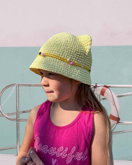 This crochet pattern contains step-by-step instructions on how to make a crochet kids bucket hat with ears.