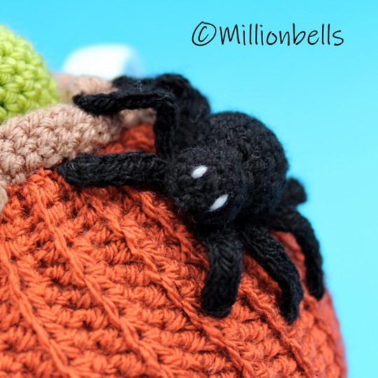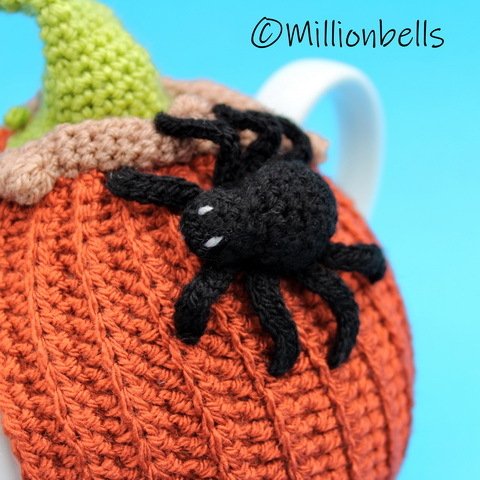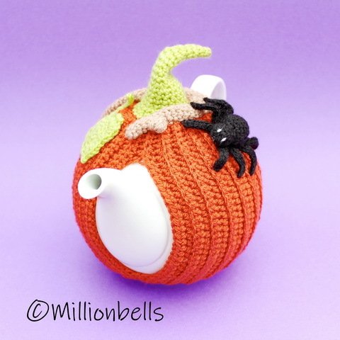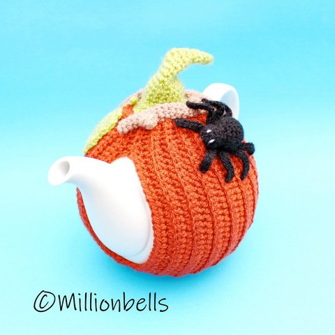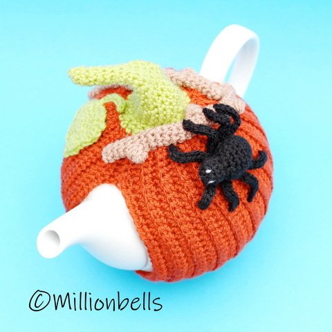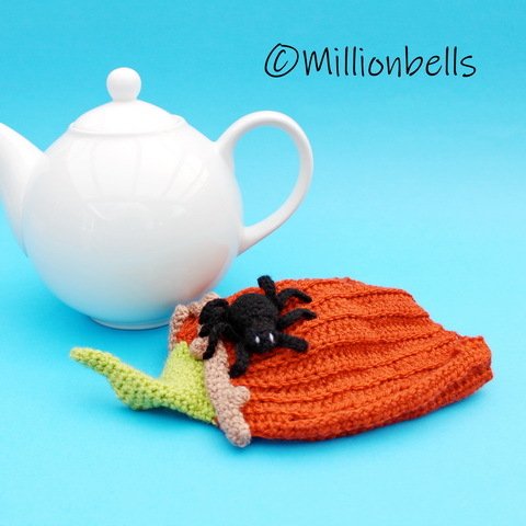 The pumpkins’ stem is joined to the top of the cosy, to cover the knob of the teapot nicely.