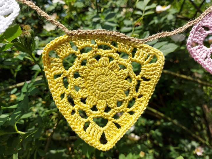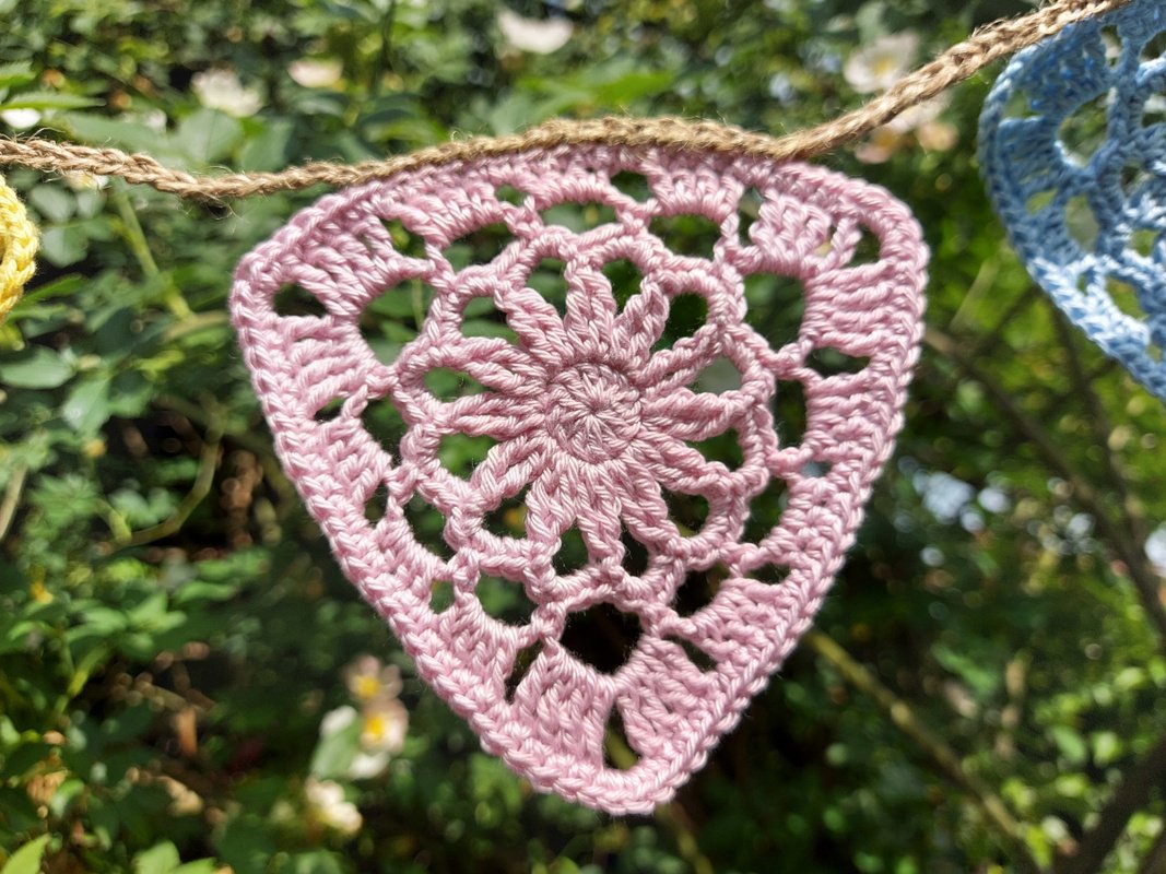 The width of each bunting is 13.5cm (5.3in) using a sport weight cotton yarn and a 2.5mm hook.