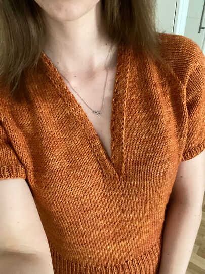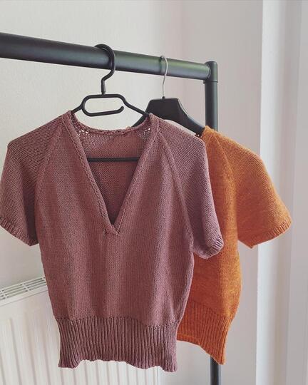 The pattern describes all the necessary steps. There are several alternatives: The Tee can be knitted without the waisted fit; the depth of the v-neck is variable.