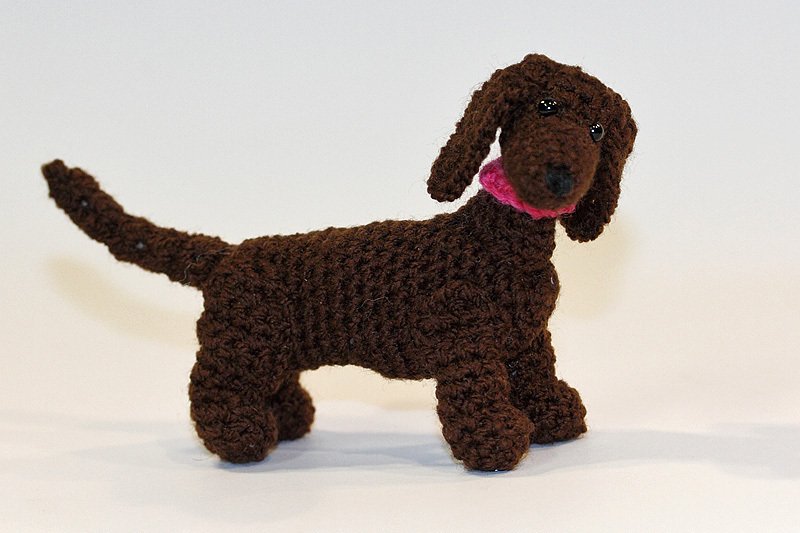 Crocheted with crochet hook size 2.5, the standing dachshund is approx. 13 cm long and 8 cm high.