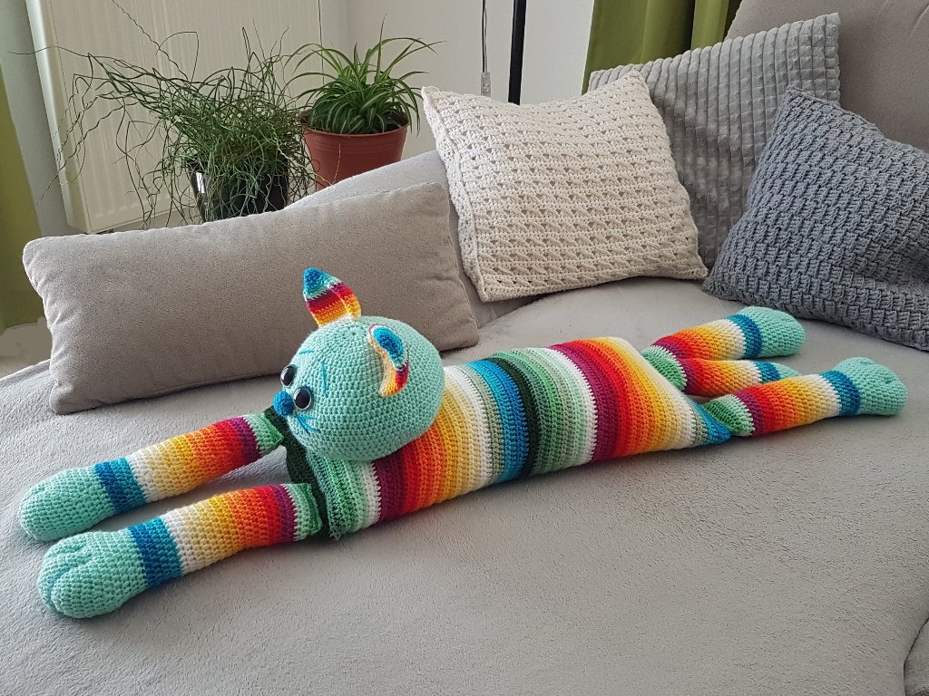 Nach Fertigstellung wird die Regenbogenkatze ca. 108 cm lang (mit Beinen gemessen).