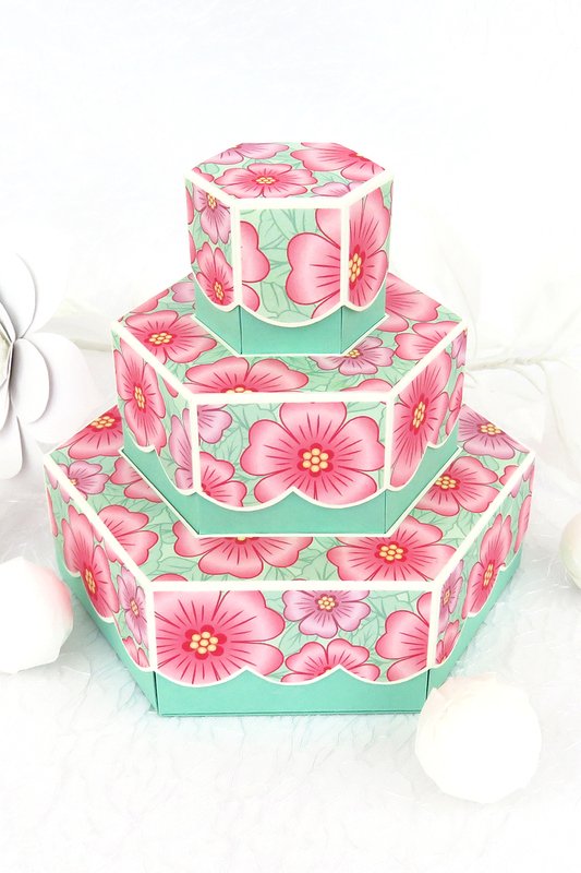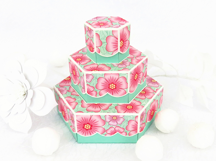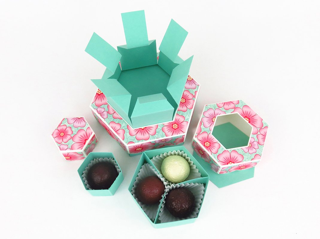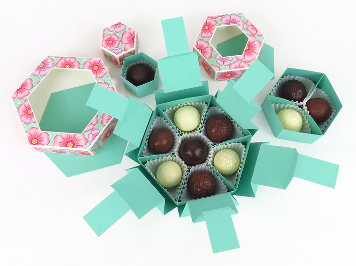 Mit dieser Schachtel habe ich eine weitere ausgefallene Idee zum Verpacken von Pralinen in meinem Store. 11 Pralinen von 3-3,5 cm werden hier auf drei Etagen untergebracht und der Inhalt jeder Etage bleibt solange ein Geheimnis, bis der entsprechende Deckel abgehoben wird.