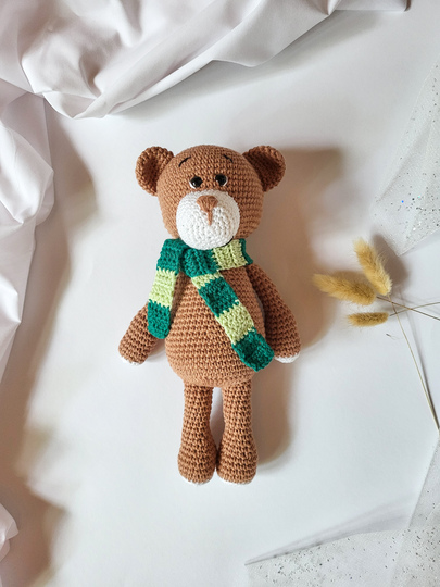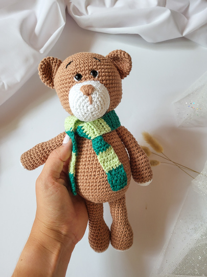 Crochet the bear with a crochet hook of 3mm and yarn for this hook size. The bear will be about 26cm (10inch).