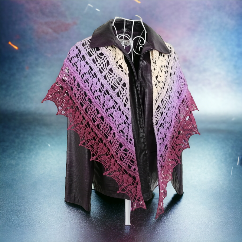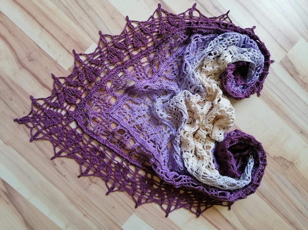 This beautiful triangle scarf is light and breezy and has a pattern that mimics small leaves. This crochet pattern is written in US-terminology.