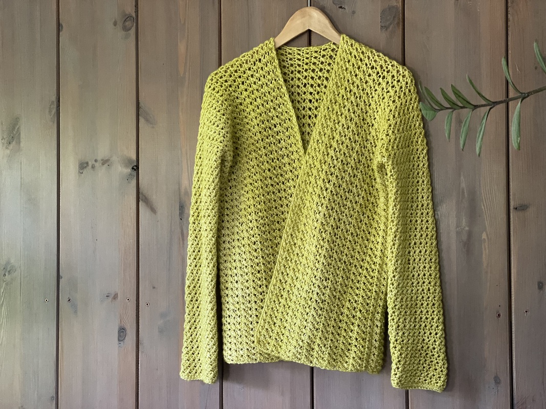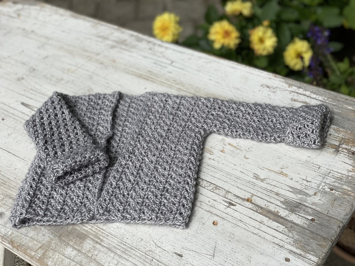 The cardi can be crocheted in any size (babies to adults) using any yarn you like.