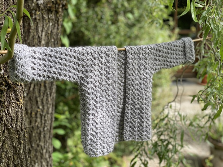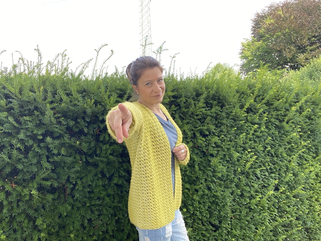 The cardigan is worked sideways and without any seams. It is worked in one piece, so this project works very well with variegated yarn, too. Additionally, there are no fixed sizes. Instead, you can customize the length and width according to your own preferred measurements by following the detailed instructions in this pattern.