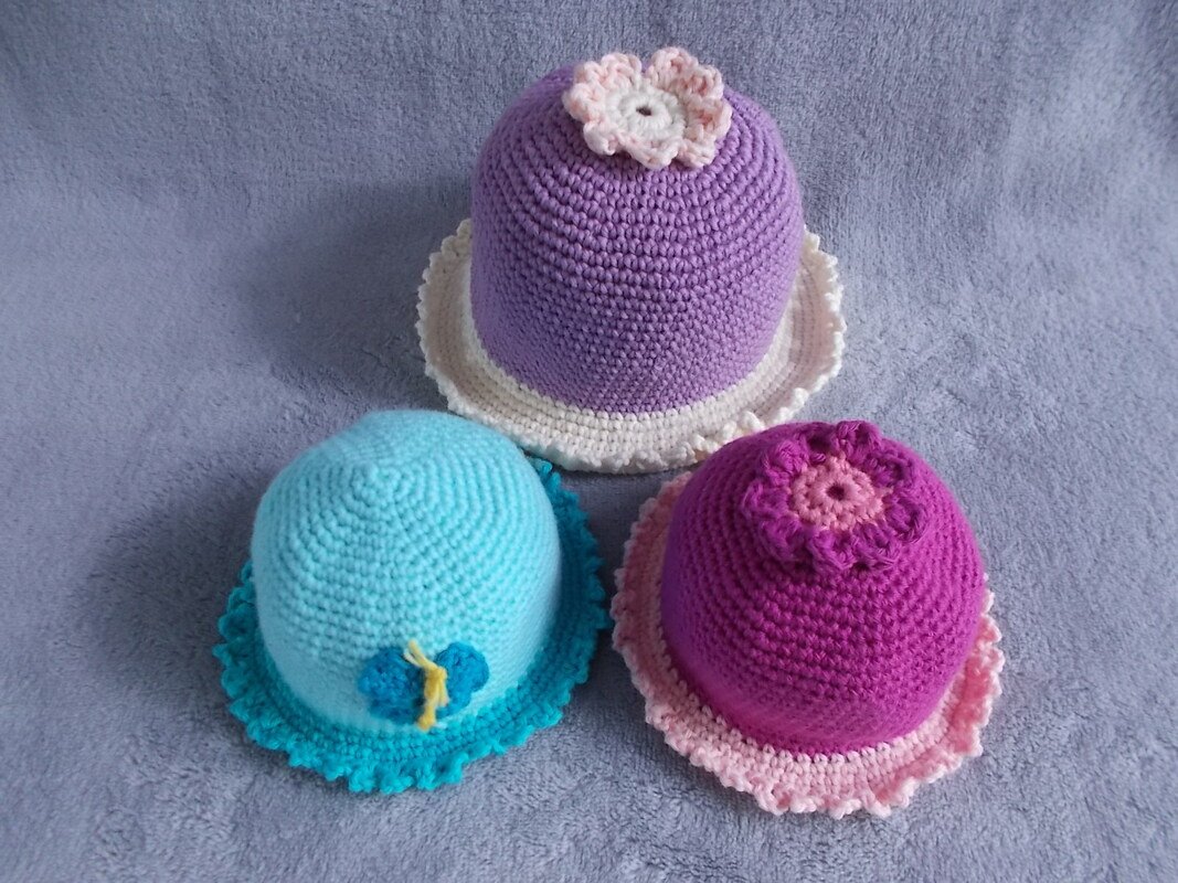 Ich habe die kleineren Hütchen mit Baumwolle – Lauflänge 160 m/50 g – gehäkelt, das größere Hütchen mit Baumwolle 100 m/50 g. Es ist also alles möglich.