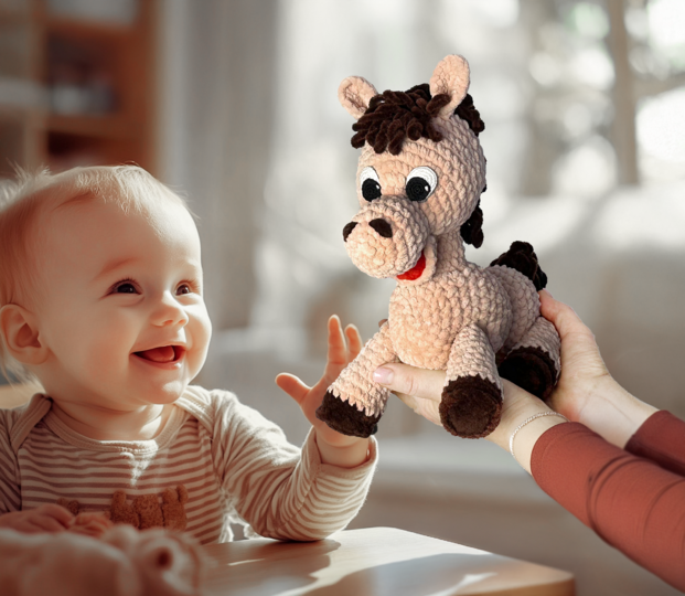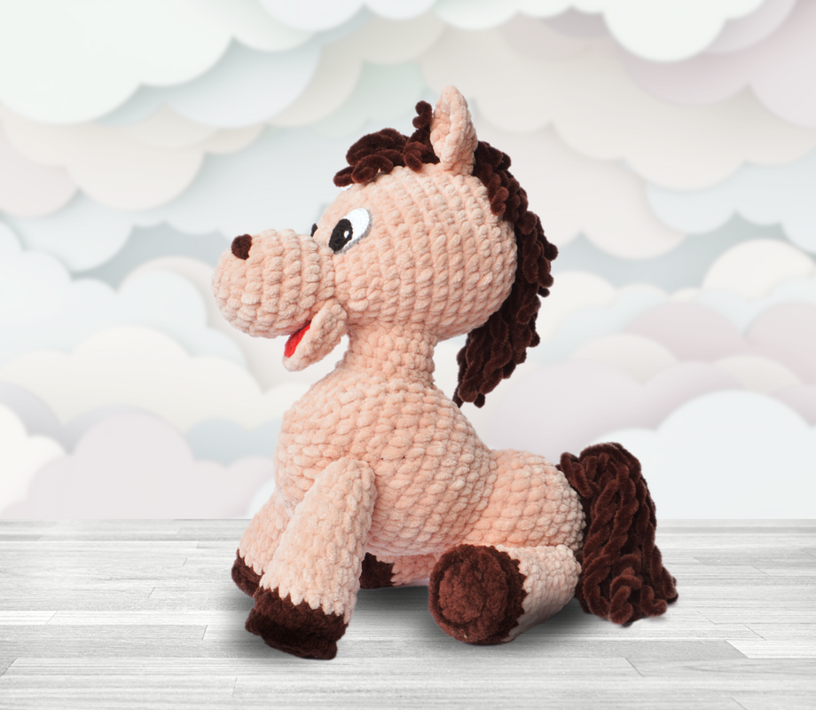 Die Mähne habe ich für mich in Korkenziehersträhnen (LM_Kette und dann zurück 3 fM pro LM) abgeändert, das lag auch daran, dass ich nicht die vorgeschlagene Chenillewolle benutzt habe, sondern doppelte dickere Baumwolle, da es ein Geschenk für ein Baby war, und dadurch besser waschbar.