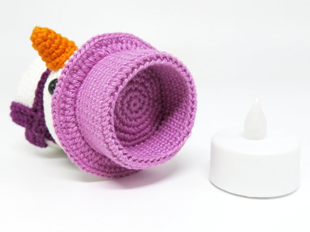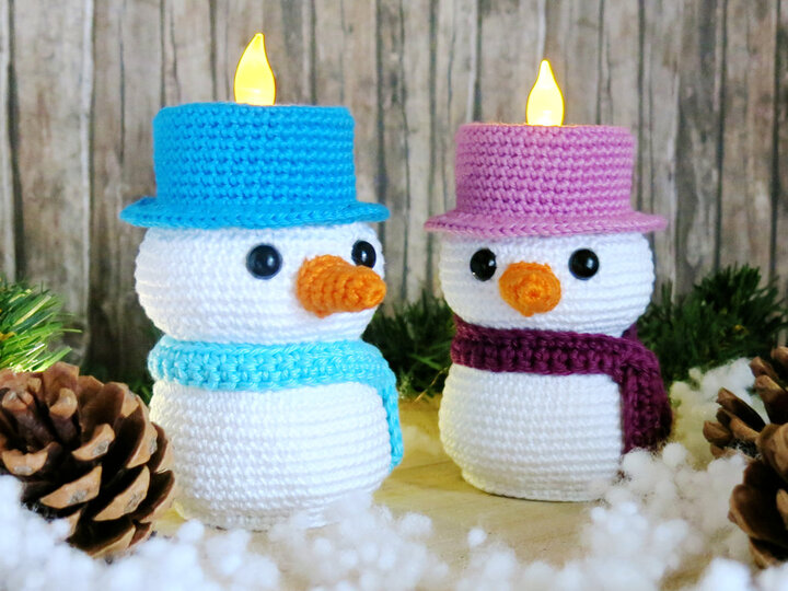 With 2.0 mm hook and sport weight yarn the snowman gets to be 10 x 6 cm tall (without tealight).