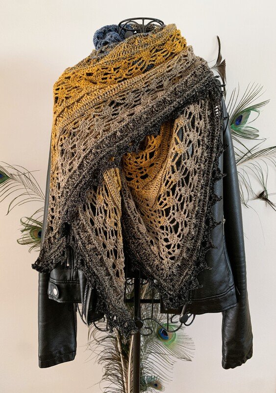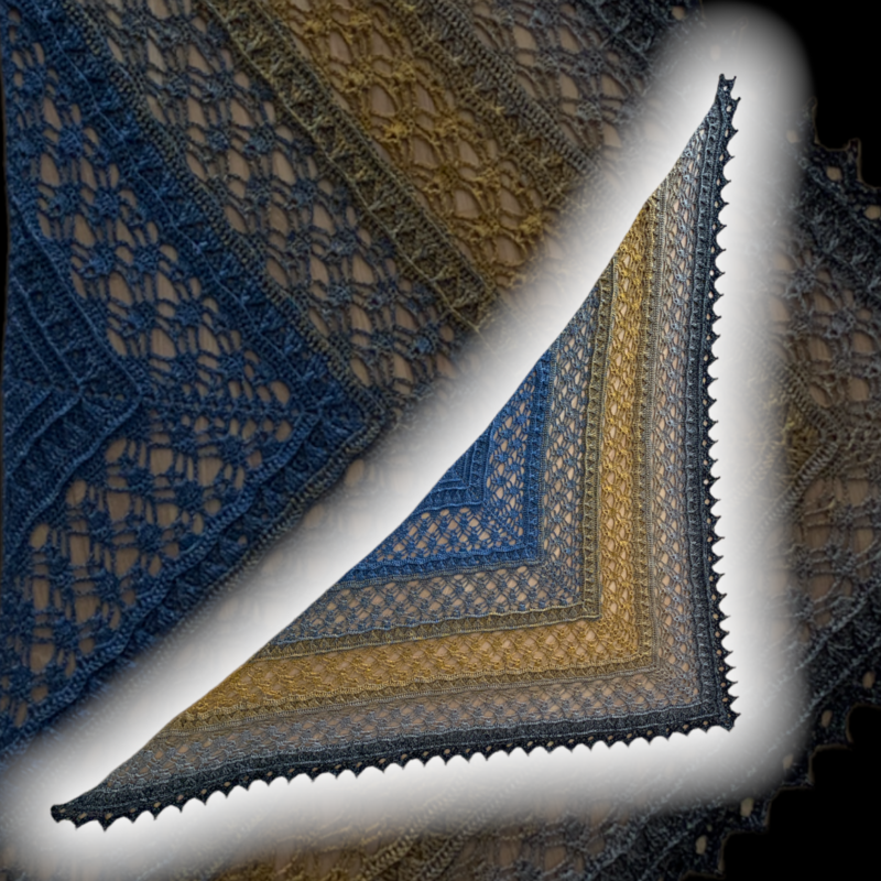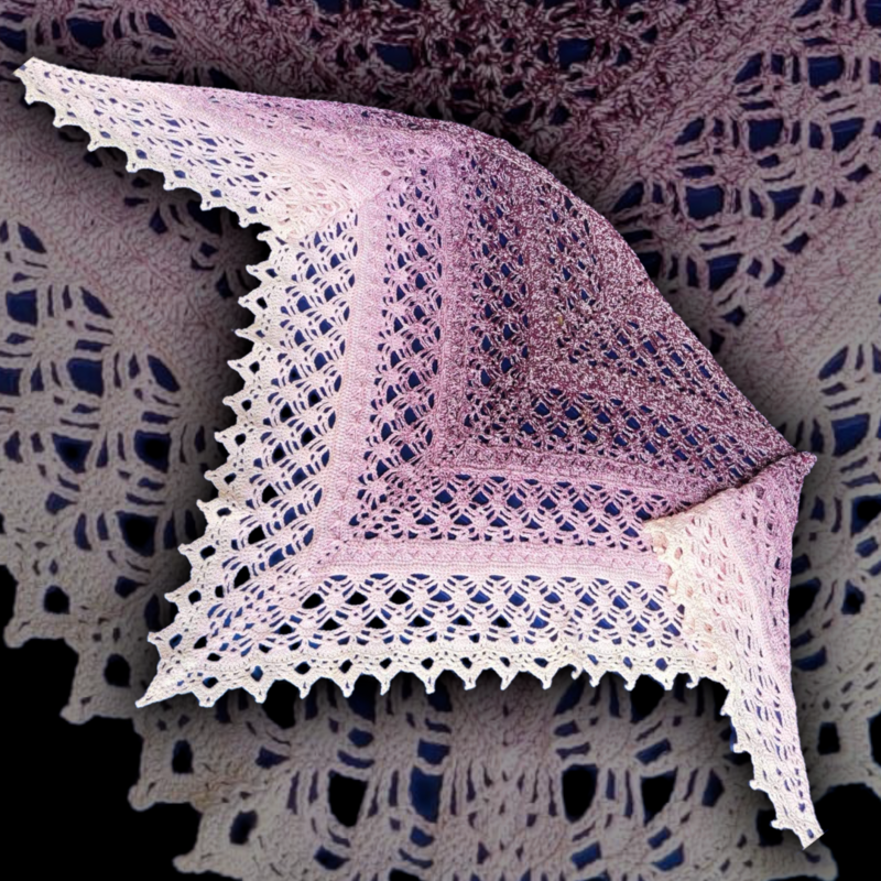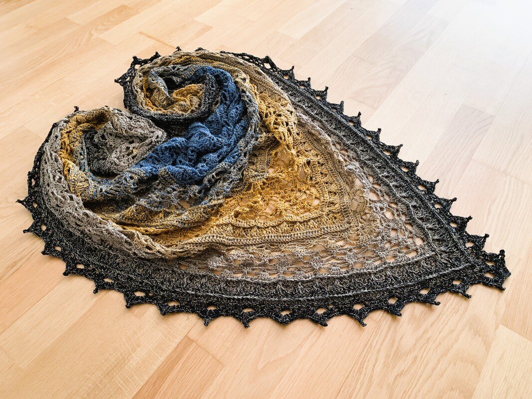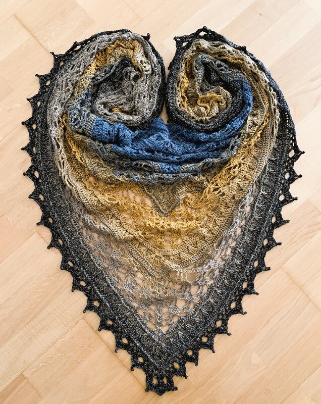 With this pattern you can crochet a beautiful triangular scarf "Algea". The pattern repeats itself after some rows, therefore the scarf can be crocheted in any desired size.