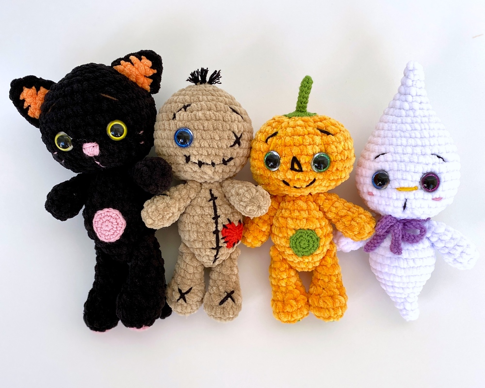 Crochet your own adorable little plush toys for Halloween: Pumpkin and Voodoo dolls, Ghost and Black cat !